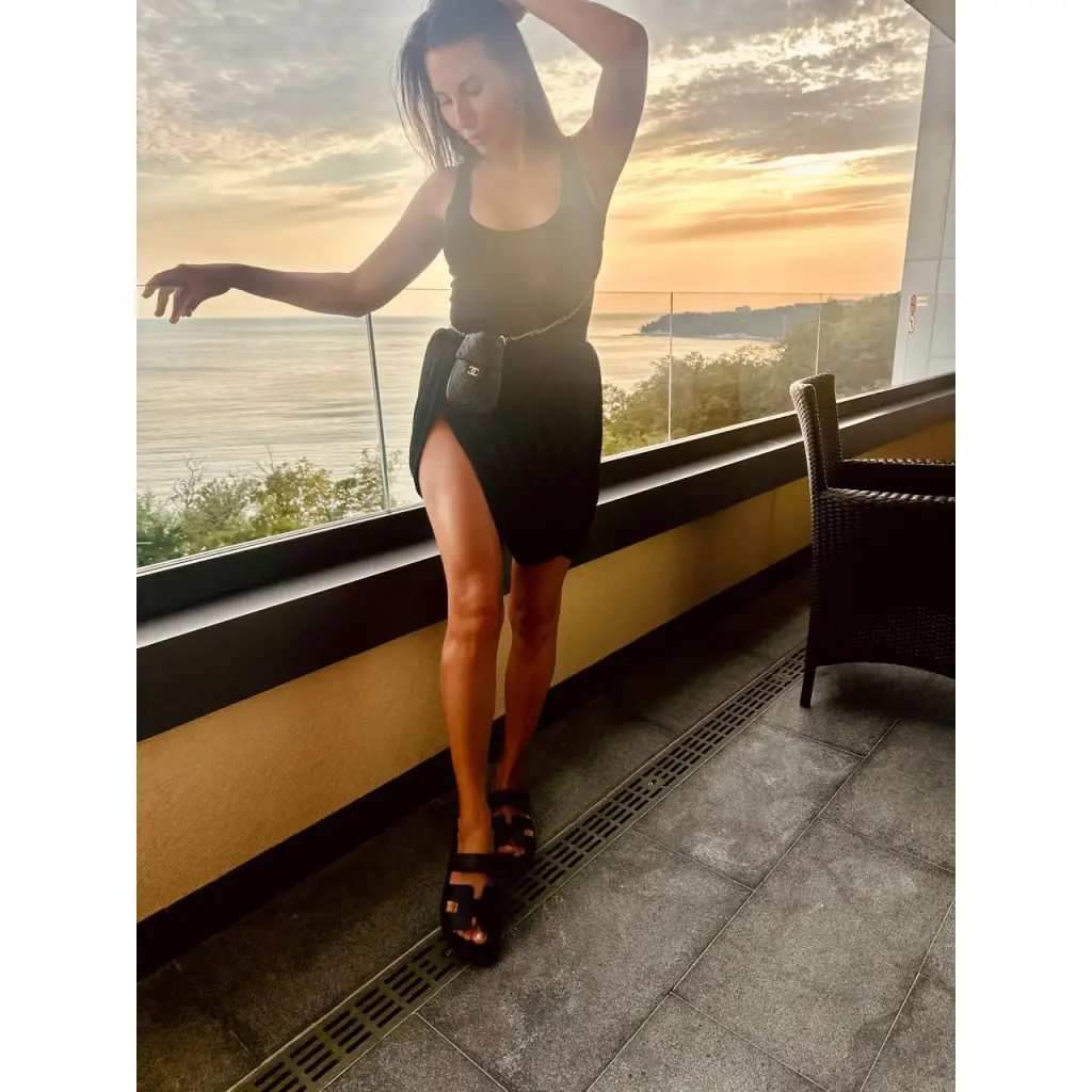 Черная кожаная сумочка на длинной цепочке.