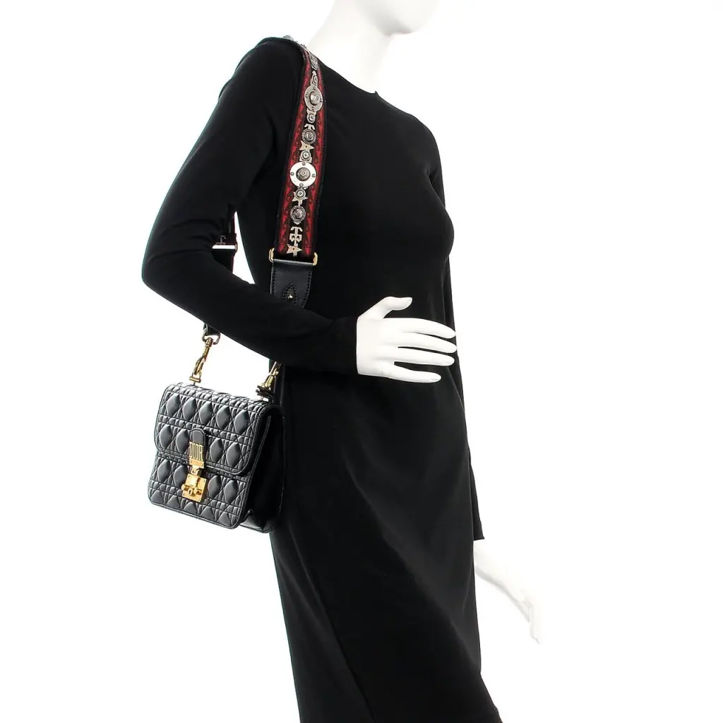 Плечевой ремень (стоимость ремня отдельно 145.000 ₽ на оф.сайте Dior) в богемном стиле, украшенный состаренными серебристыми медальонами и кожаными деталями из кожи ягненка. Ремень позволяет легко переходить от плеча к ношению через тело. Сумка также имеет кожаную бирку, которую редко можно увидеть на сумке через плечо.