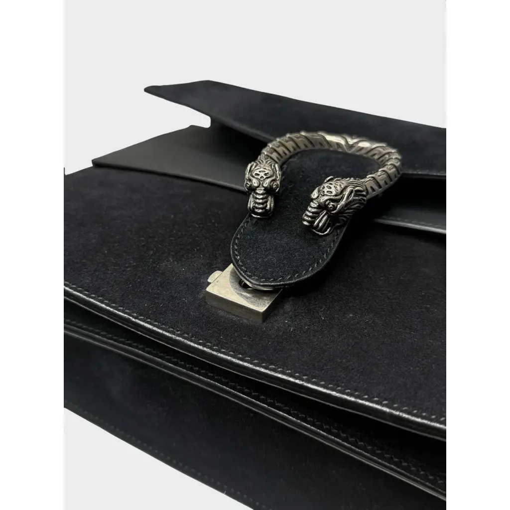 Замшевый верх с объемным ворсом, кожаная начинка и культовая фурнитура: суровый тигр, оберегающий клапан сумки — олицетворение Gucci второго десятка 21-ого века. В противовес нежной замше — массивная цепь, которая служит ручкой: она придает сумке брутальность и характера.