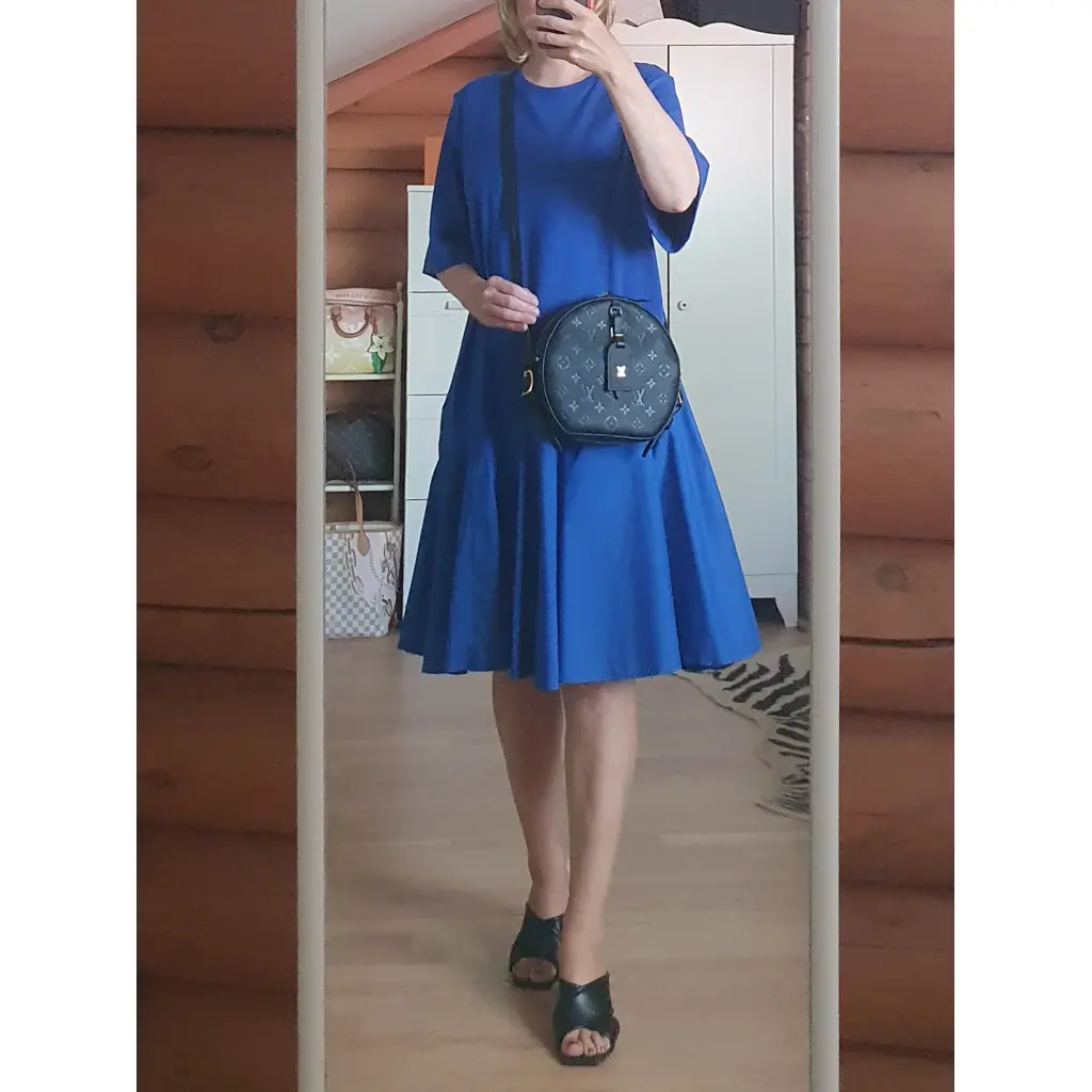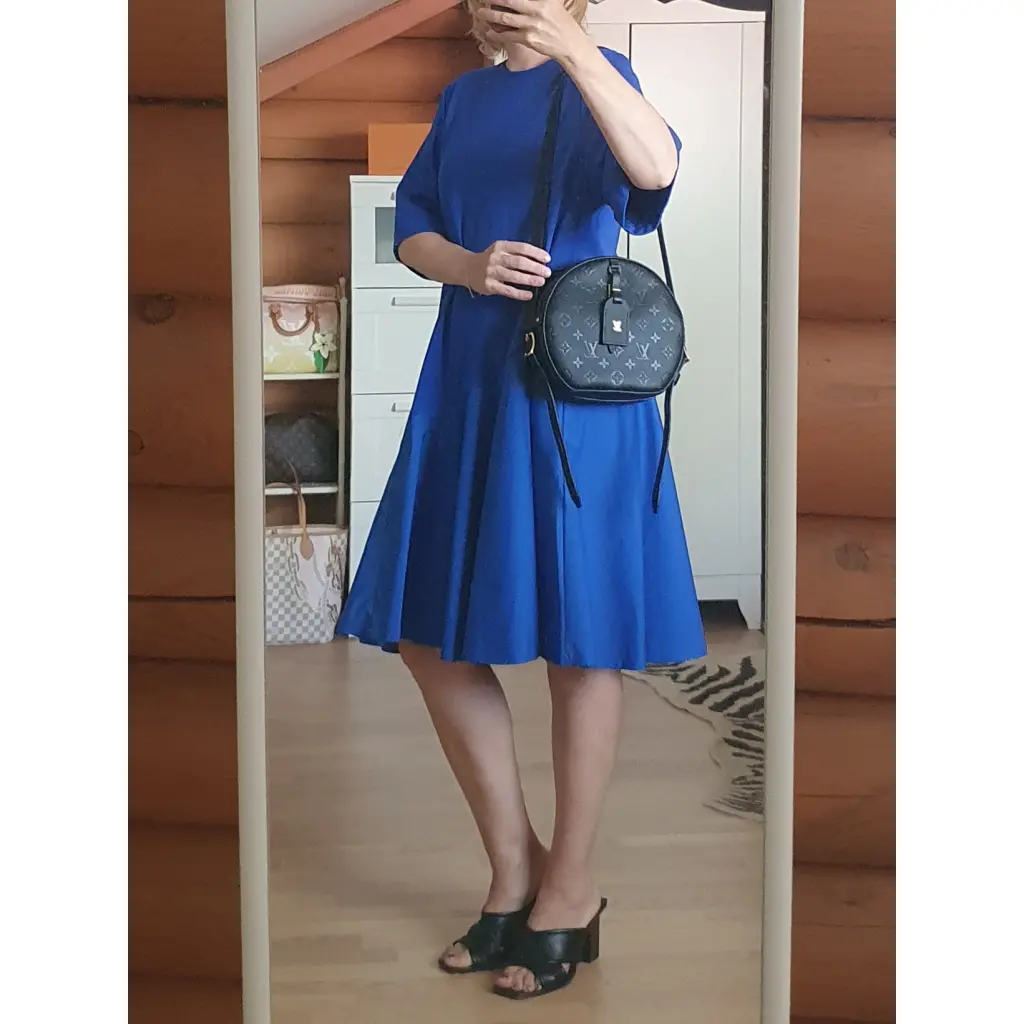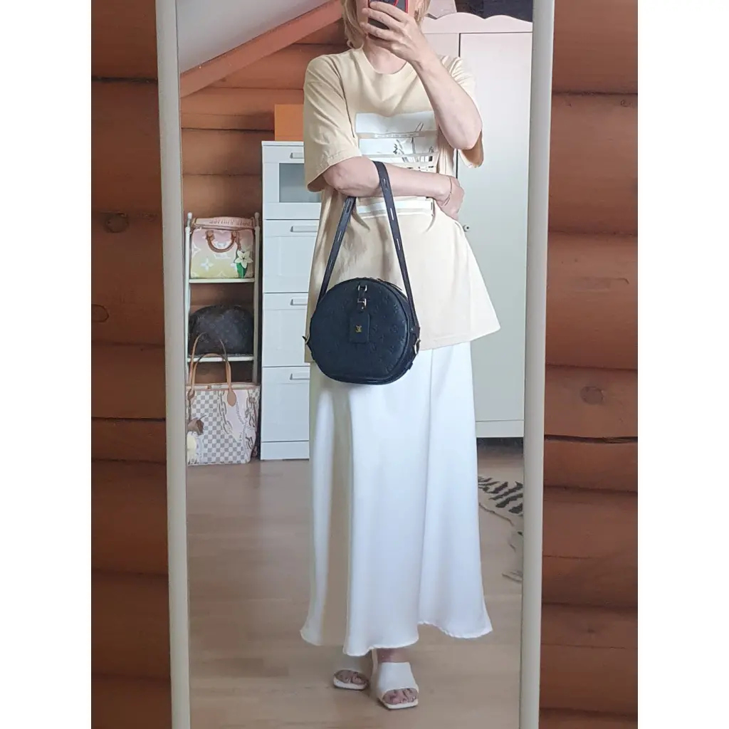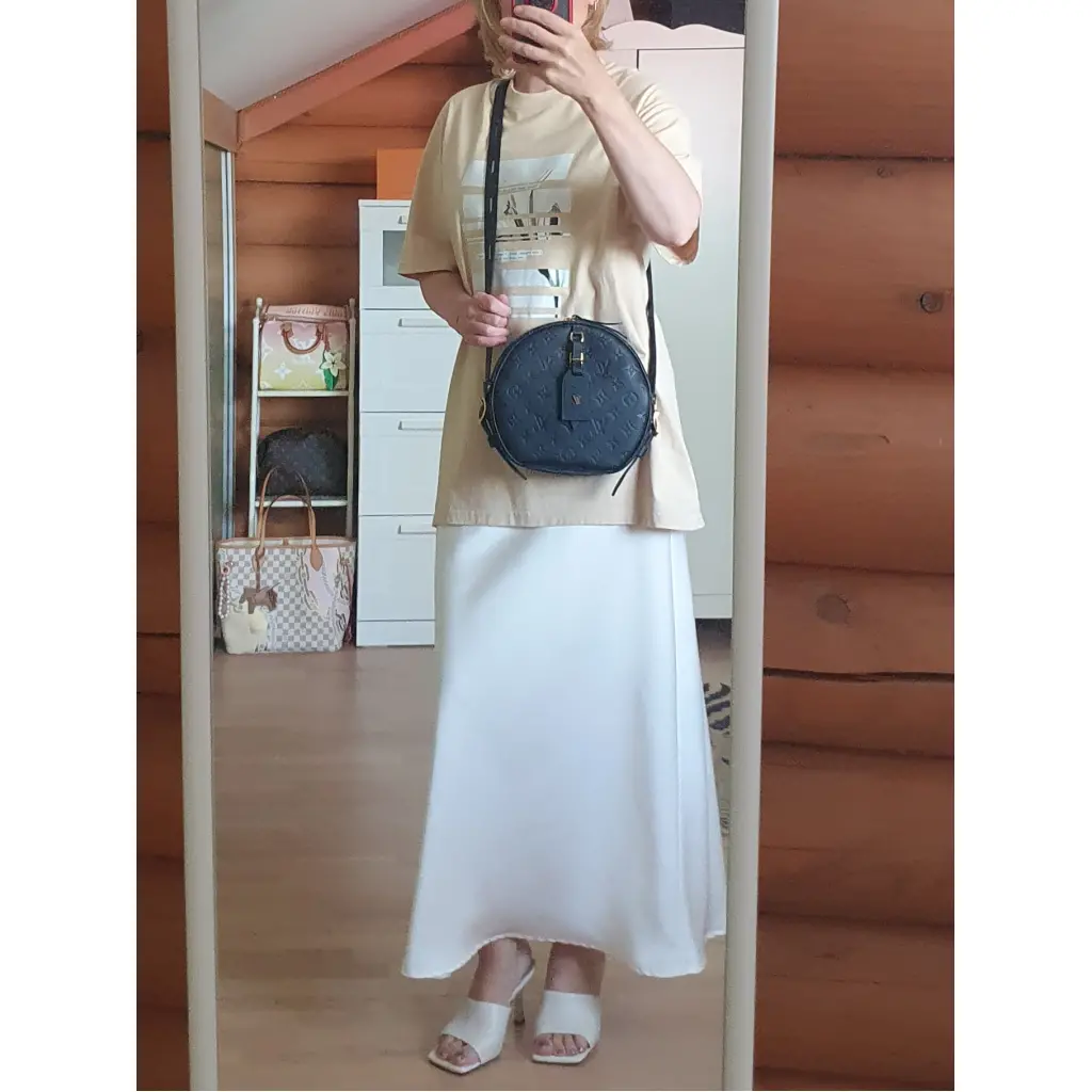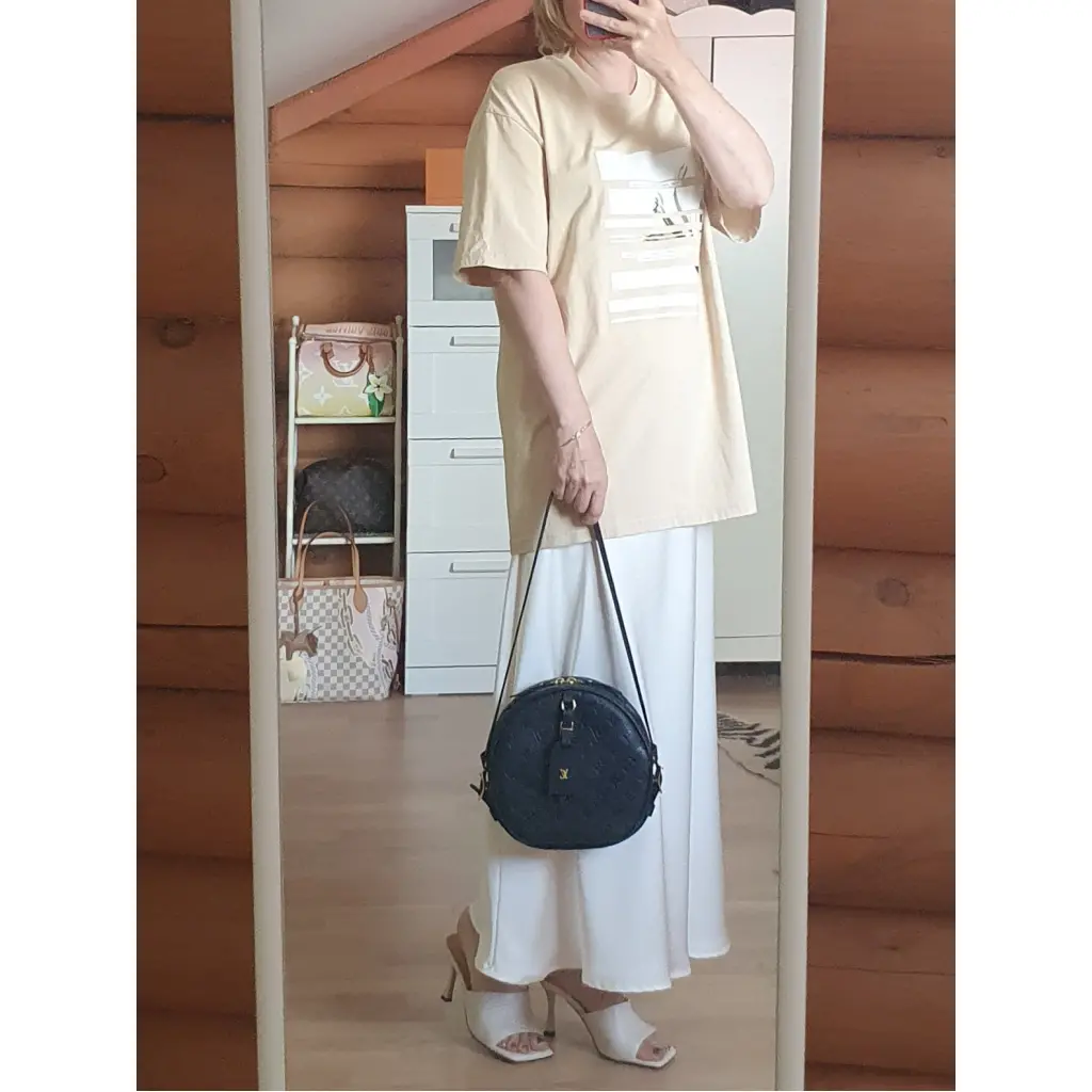 Сумка Louis Vuitton Boite Chapeau Souple MM из очень тактильно приятной черной кожи и тёмно-антрацитовым подкладом из микрофибры. Покупала на официальном сайте 22 февраля 2022 г., стоила дорого, чек сохранился. Состояние как новое, красовалась в ней раза три, не больше, т.к. по вместительности и функционалу эта сумка соответствует моему постоянному пошету Метису. Вероятные следы носки нужно искать при ярком освещении и сильном приближении ( какие-нибудь микро-царапки на фурнитуре и пылинки на подкладе), невооруженным взглядом их не видно. Полностью перфорированный овальными и круглыми отверстиями длинный ремешок 150 см можно пристегивать за любое отверстие на нужную длинну и носить на плече или кросс-боди. Концы ремня можно оставлять красиво свисать или заправлять разными способами в специальные перемычки. Комплект полный: пакет, коробка, лента, пыльник, бирки, конверт с буклетом и квитанцией.