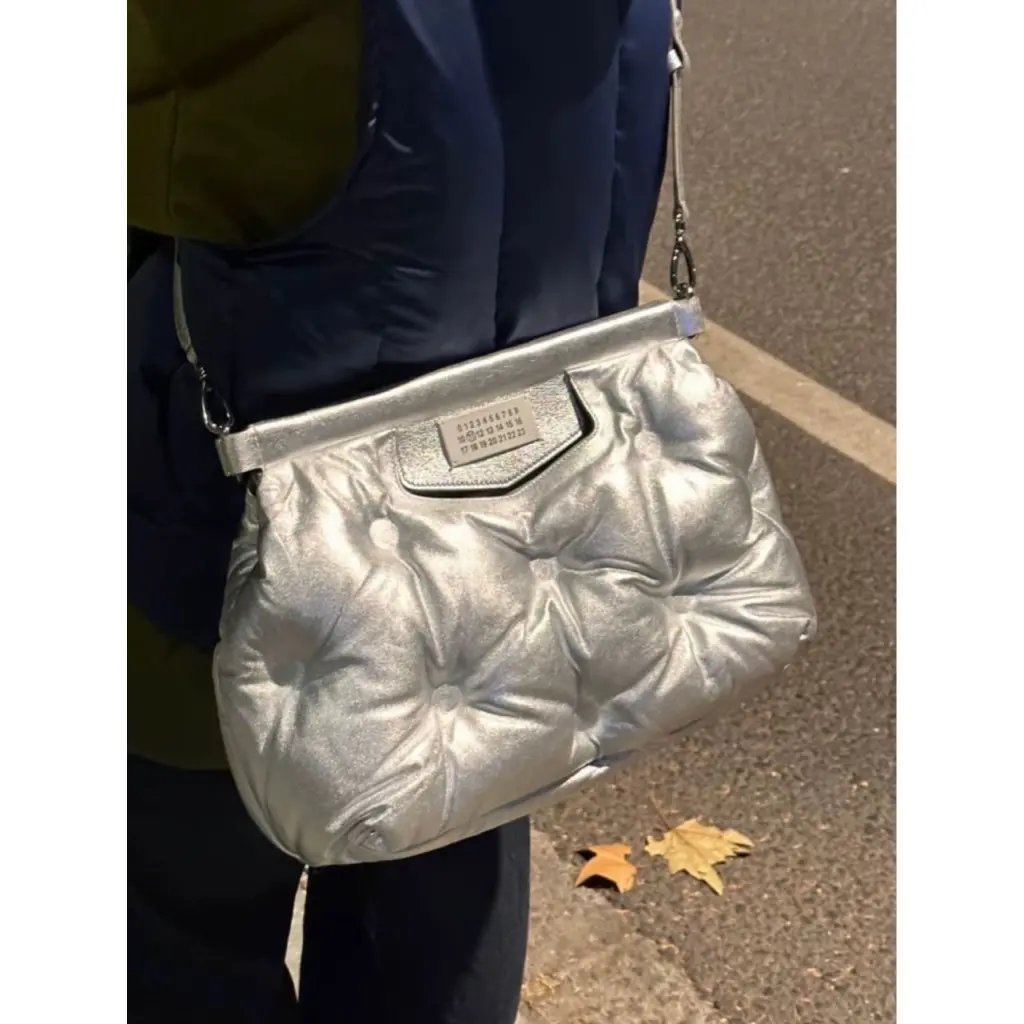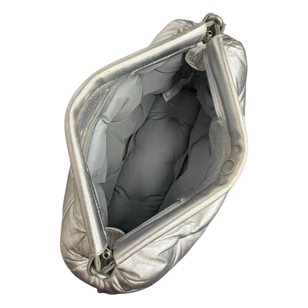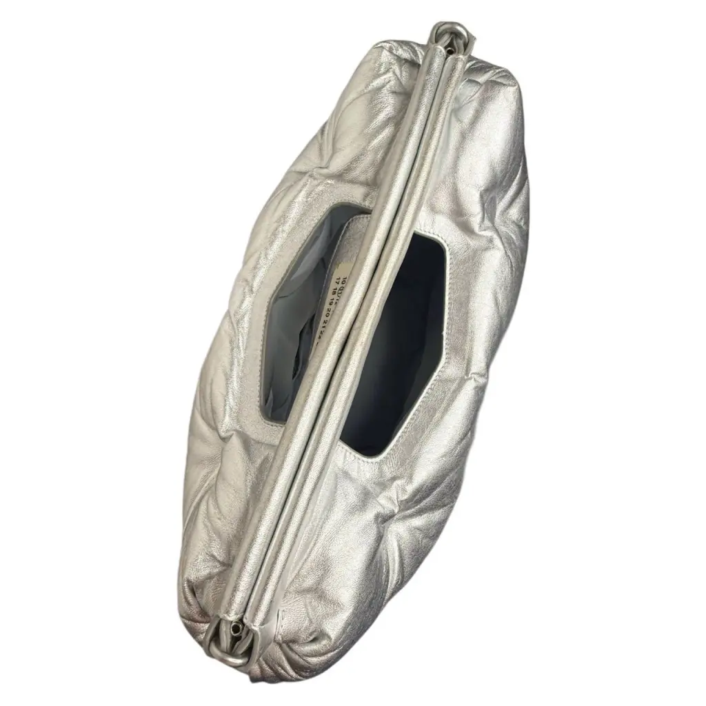 Пухлая сумка-клатч Maison Margiela Glam Slam – крайне редкая модель 2019-ого года в отличном состоянии, изготовленная из мягкой стёганой кожи с эффектным серебряным покрытием с металлическим блеском.
