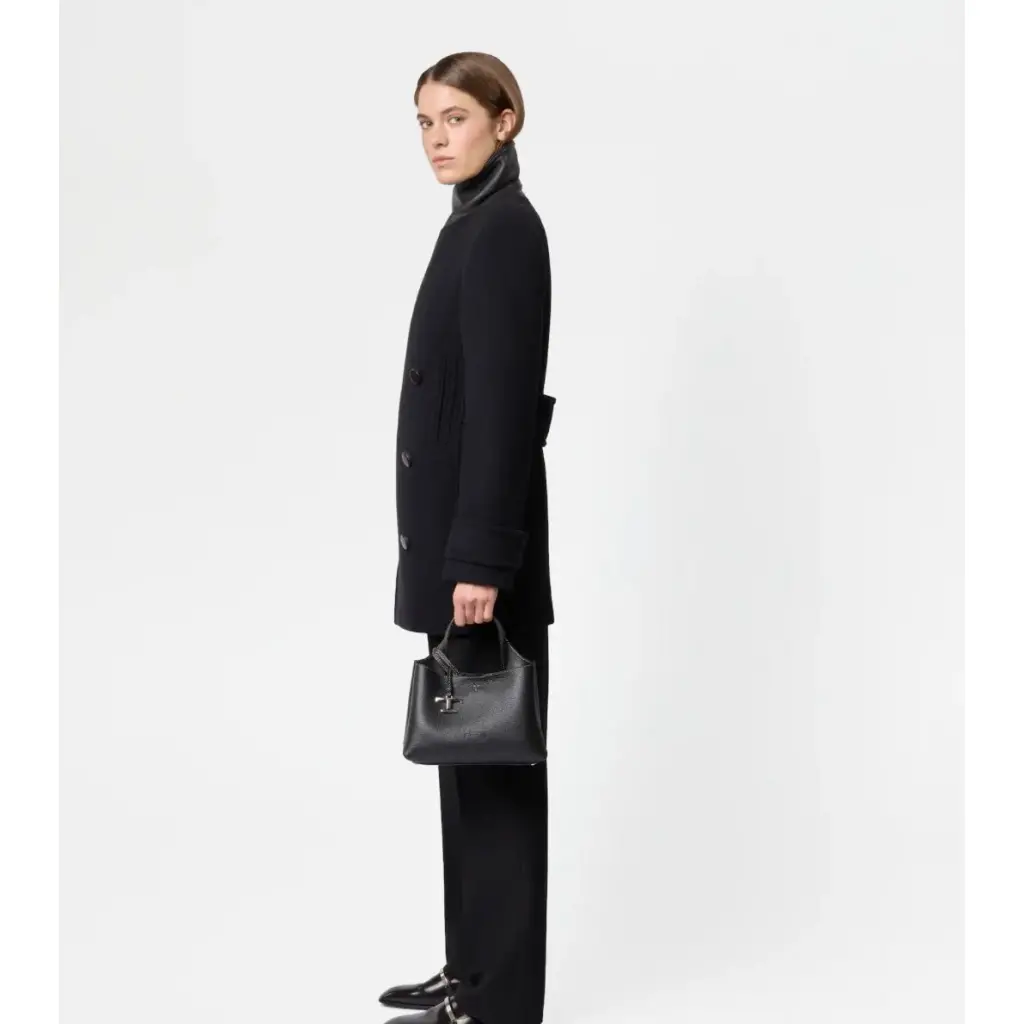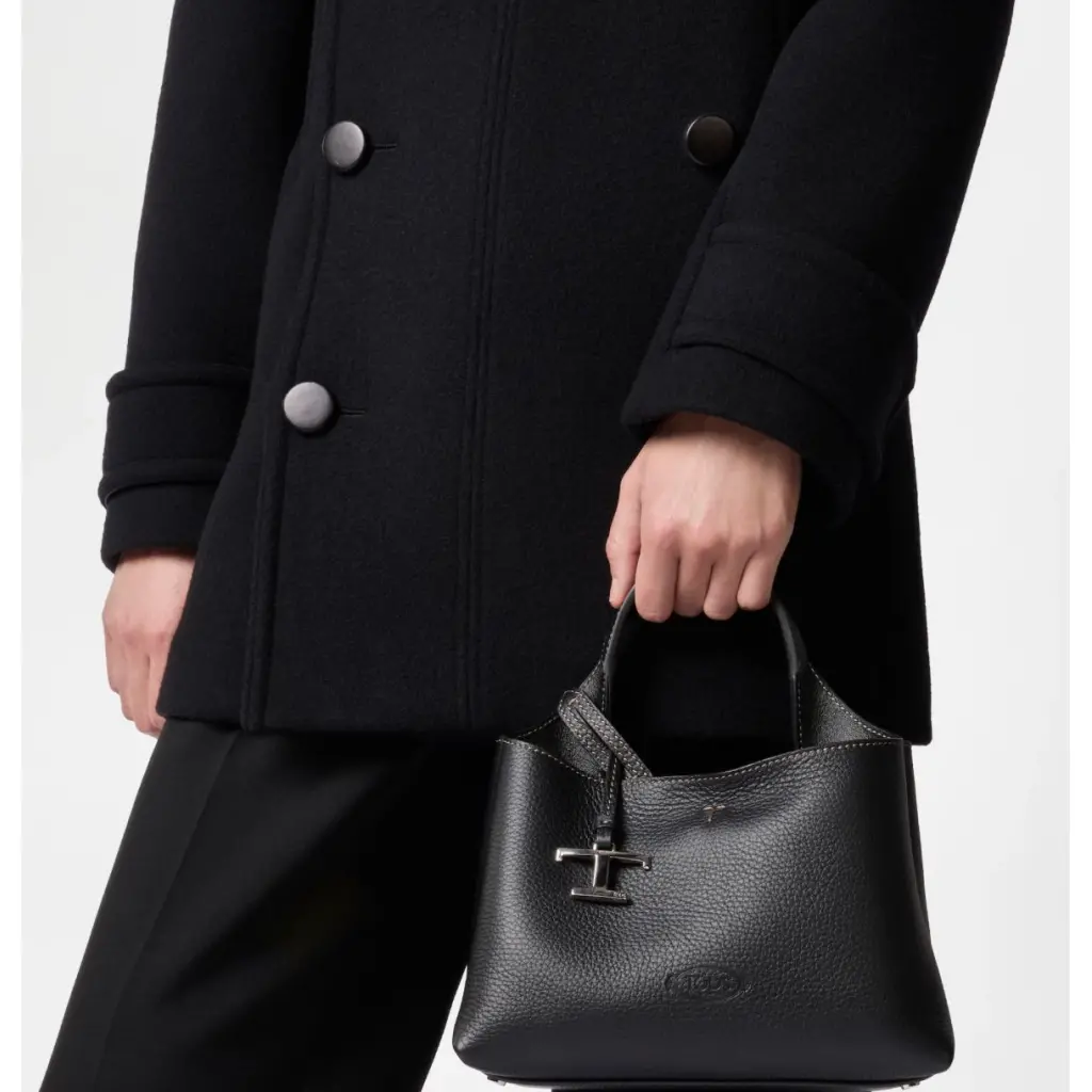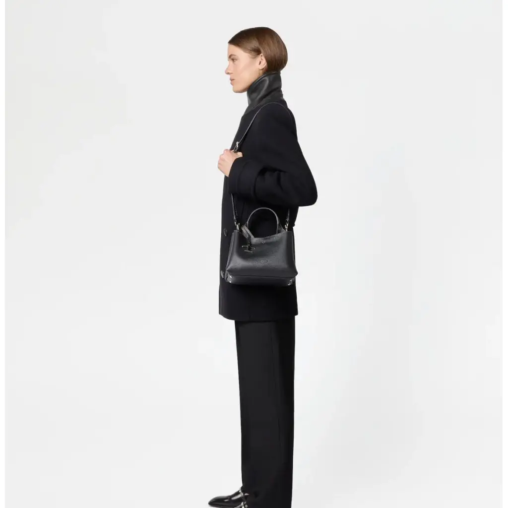 Borsa micro logo Tod's, in pelle di vitello martellata nera, due manici, dettaglio charm logo "T Timeless" rimovibile, tracolla regolabile e rimovibile, chiusura gancio, logo impresso fronte, impunture logo fronte e retro, una tasca zip interna, due scomparti interni separati, piedini metallici su fondo.