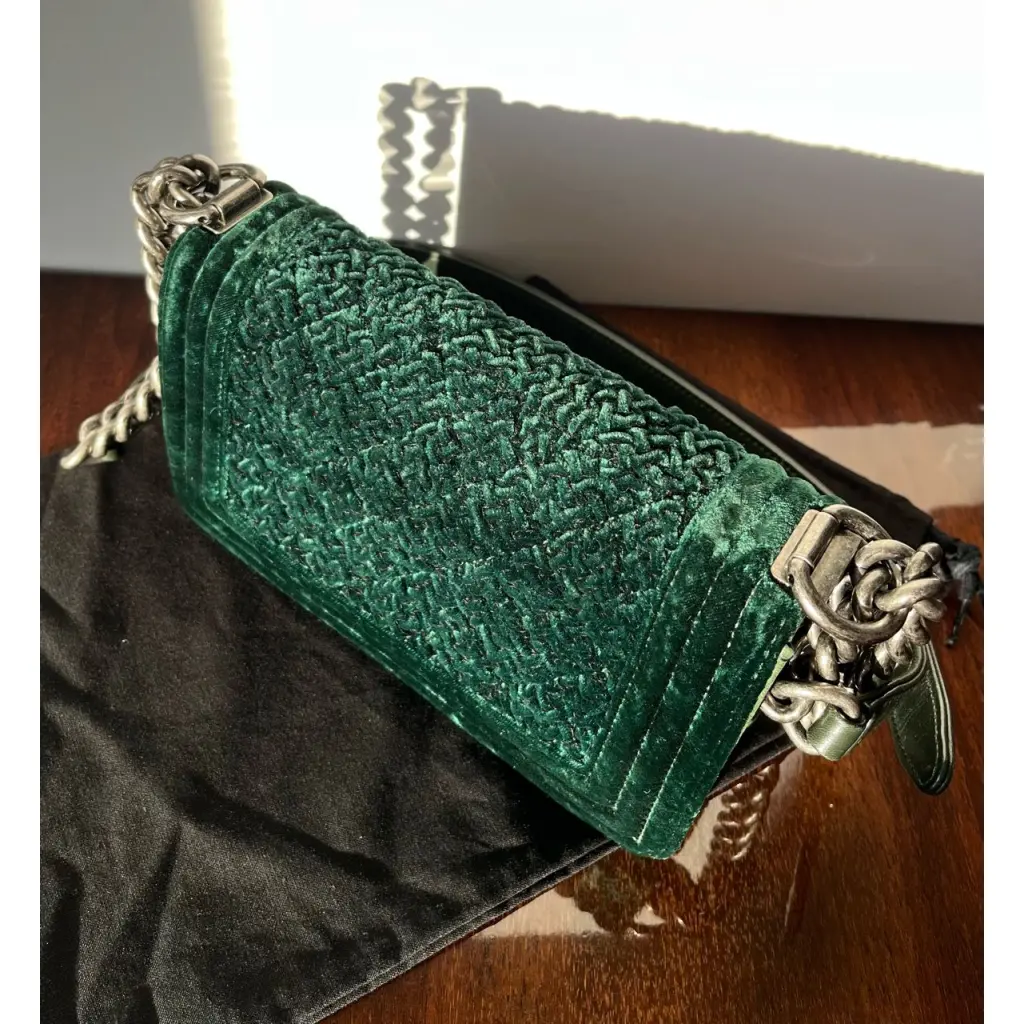 Сумка Chanel Boy из темно-зеленой овечьей кожи и бархата изумрудного цвета. Снаружи она отделана бархатом с ромбовидной строчкой и кожаными вставками в тон. Эта сумка украшена состаренной серебряной фурнитурой и застежкой-замочком в стиле lego CC.