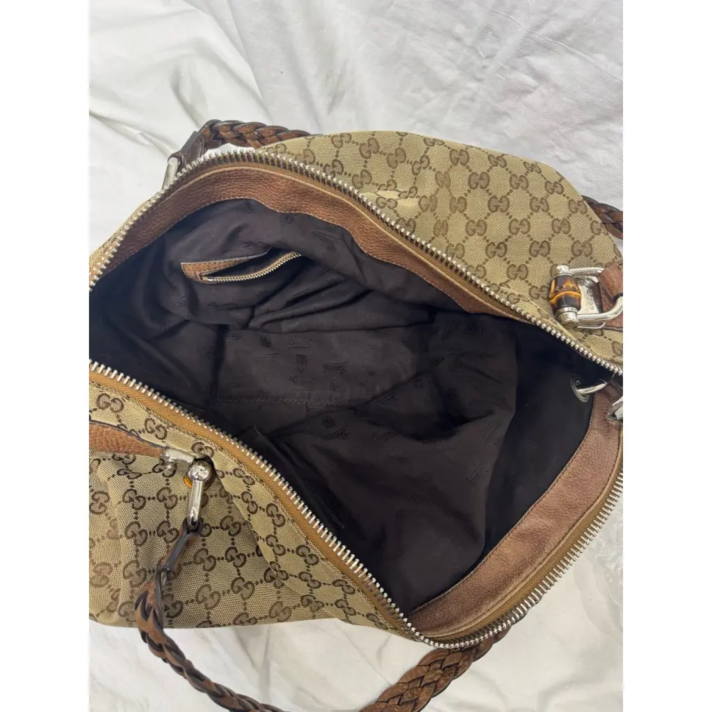 Вместительная и функциональная дорожная сумка. Модель из канвы и кожи с классической монограммой бренда. Ручки - двойные, плетеные, из коричневой кожи, украшены узнаваемой бамбуковой деталью и фурнитурой серебристого оттенка. Состояние хорошее, присутствуют незаметные пятнышки. Готова предоставить дополнительные фото.