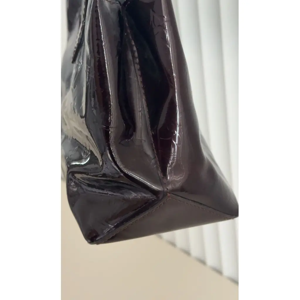 Материал: лакированная кожа с тиснением Monogram — глубокий бордовый оттенок с зеркальным блеском. Мягкая, эластичная, без трещин или складок.