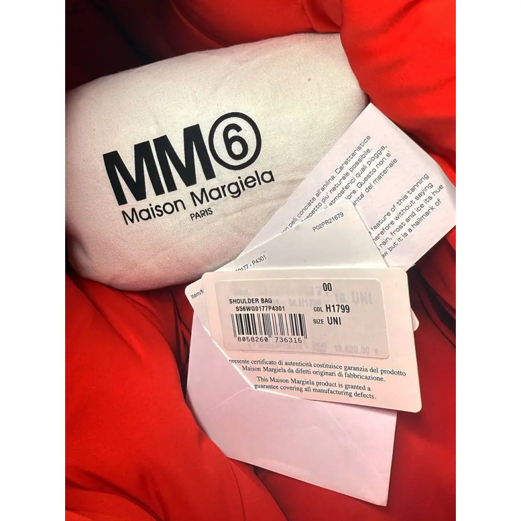 Лицевая часть дополнена фирменным нумерованным логотипом, а внутренняя отделка дорогого насыщенно-красного цвета "манит" постоянно открывать сумку. Аксессуар дополнен широким регулируемым ремнём из матовой кожи с прозрачной акриловой пряжкой в форме D-кольца: можно носить кросс-боди или через плечо. Внутрь пристёгнута вместительная косметичка, аналогичная цвету подкладки, в комплекте также пыльник от ММ6 и карточки бутика.