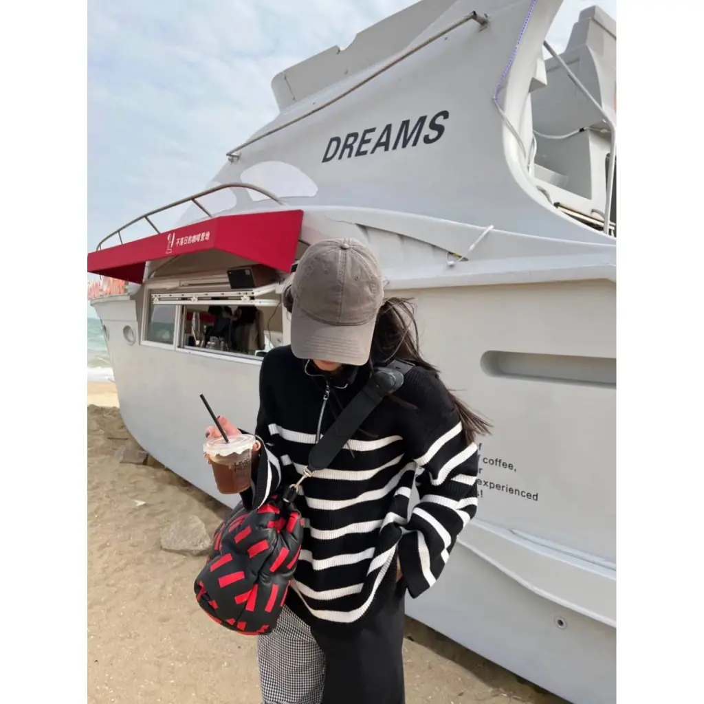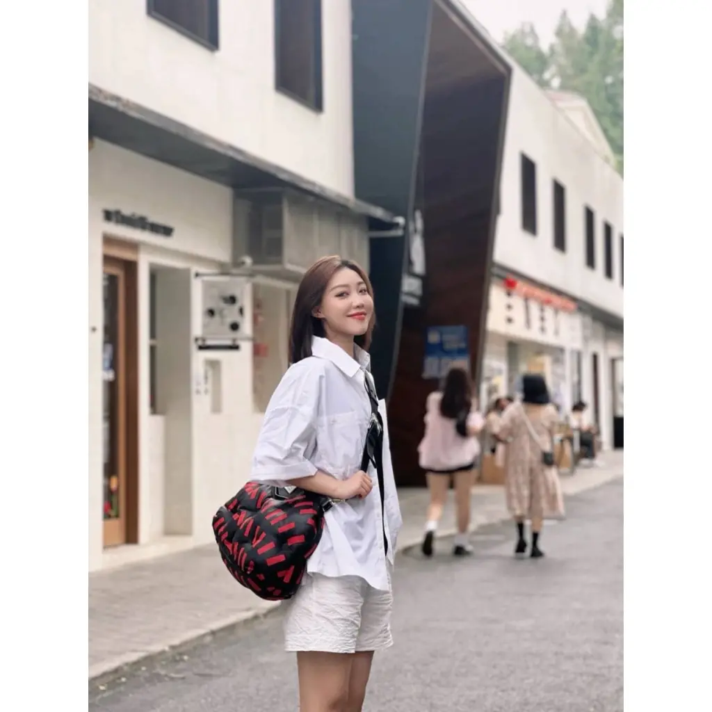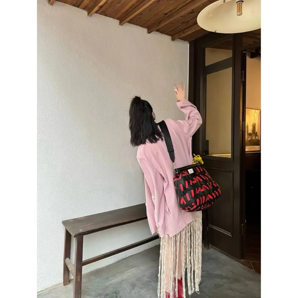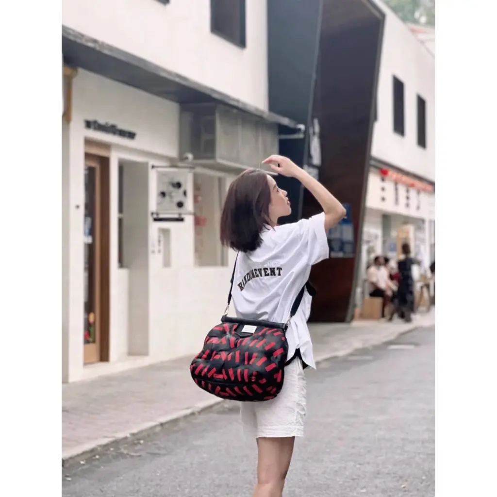 Модель примечательна вирусным дизайном, где чёрная основа идеально контрастирует с яркими красными "тейпами", разбросанными по поверхности сумки, что создает безупречный баланс красок. Сумка напоминает арт-объект и предсказуемо завоевала лидирующие позиции в рекомендациях Pinterest и аналогичных платформ.
