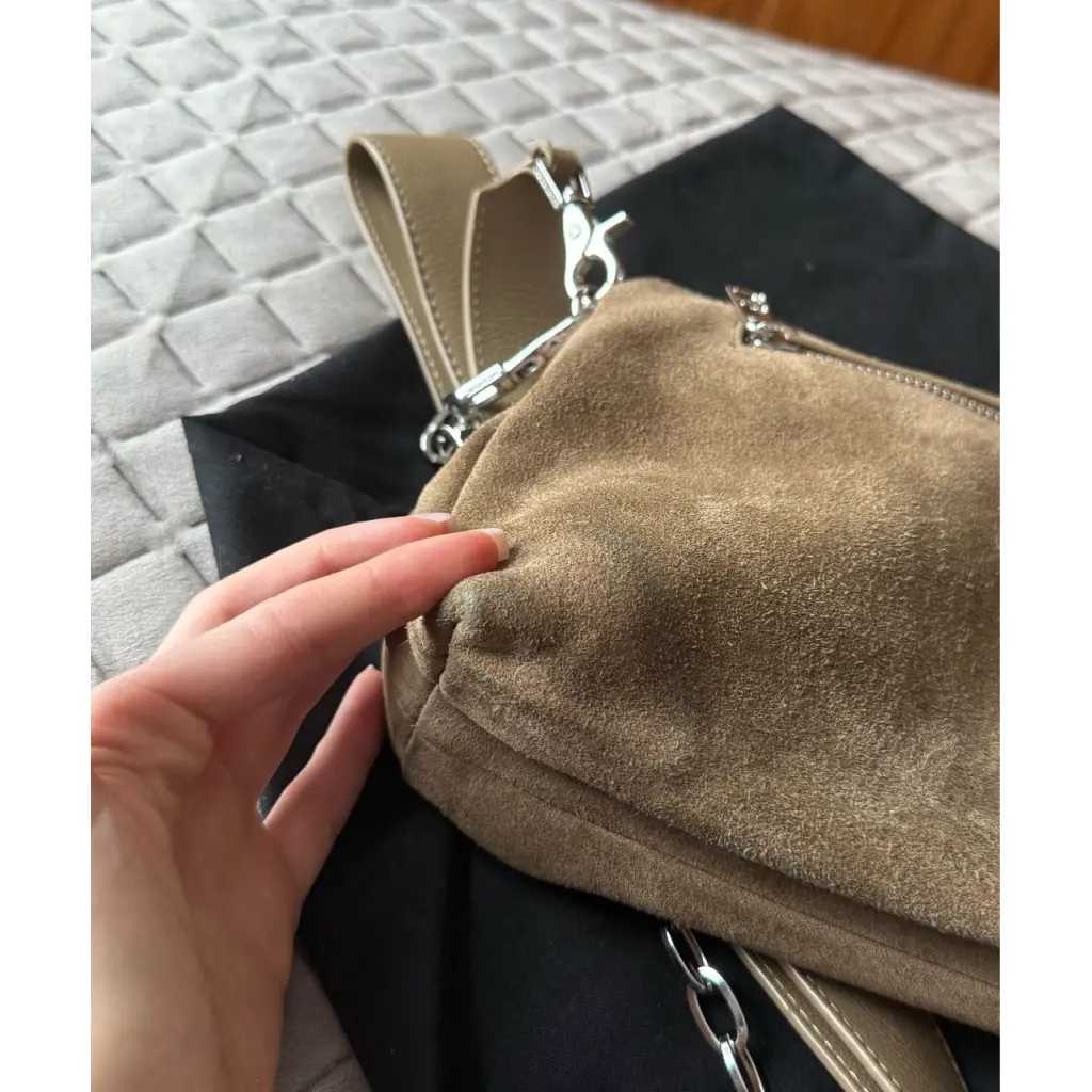 Сумка цвет хаки/коричневый (не зеленый) В хорошем состоянии, задняя часть сумки требует чистки/ухода за замшей. Нижние углы так же немного стерты, но при носке это незаметно
