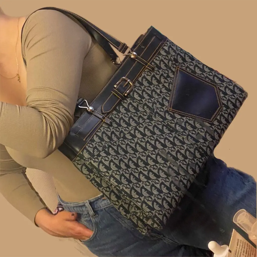 Горизонтальная объемная сумка-тоут Christian Dior Vintage Trotter Diorissimo Canvas XL, изготовленная из темно-синей канвы Diorissimo, имеет две кожаные плоские ручки, петли с пряжками и серебристую фурнитуру. Открывается темно-синим тканевым внутренним отделением со средним отделением на молнии.