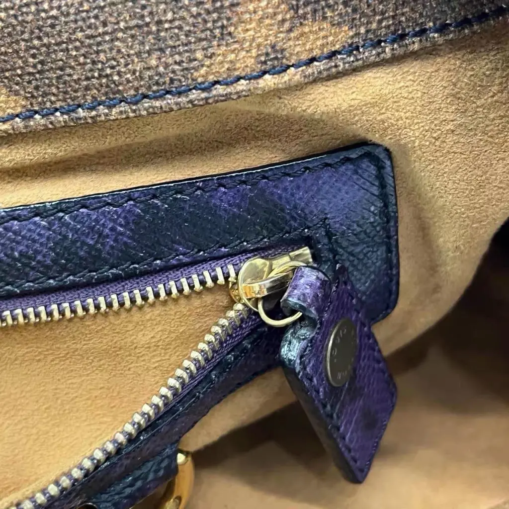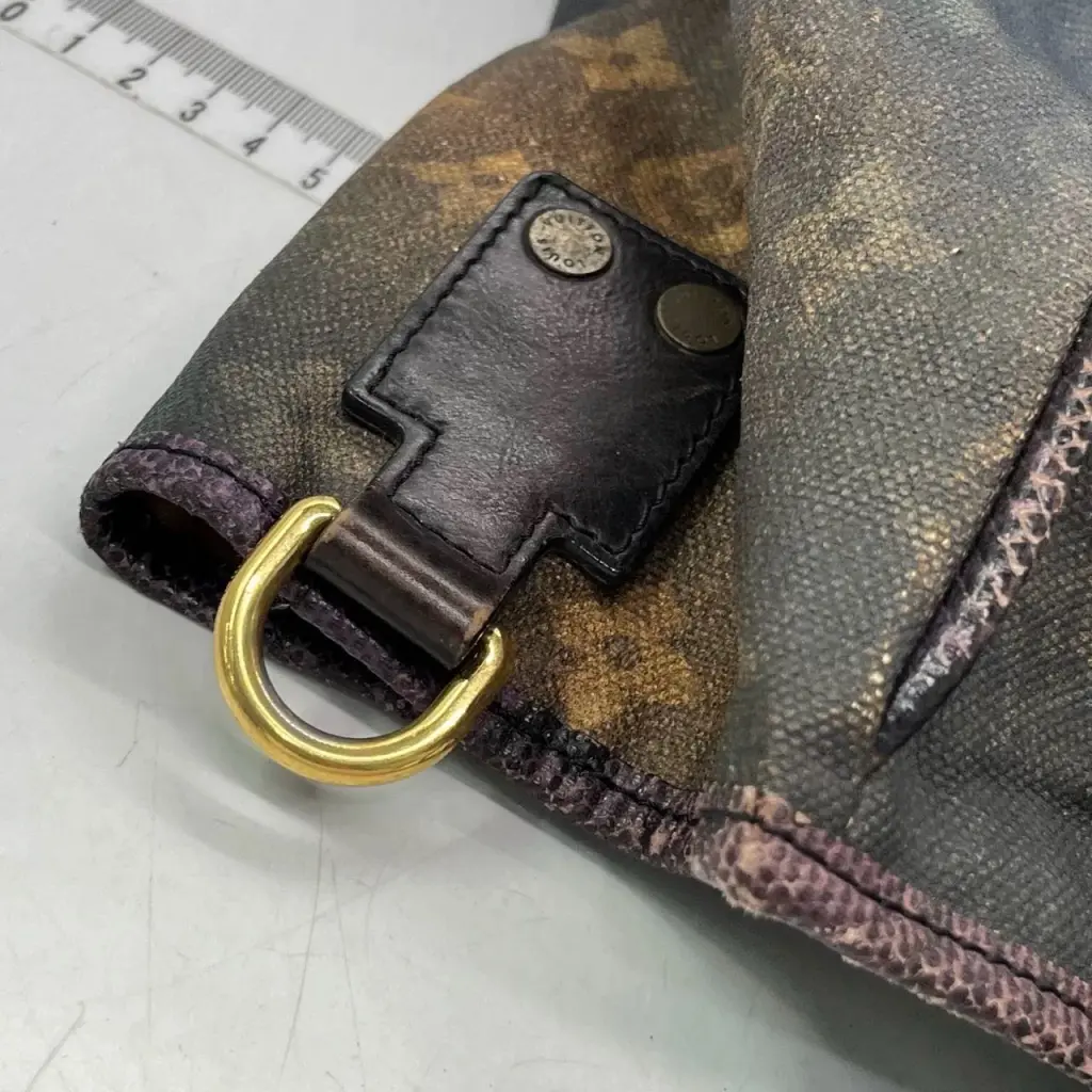 Эта уникальная сумка от Louis Vuitton выполнена из культовой ткани monogram в синих и фиолетовых тонах, а на одной стороне напечатаны небольшие шуточные строчки. Эта потрясающая сумка выпущена ограниченным тиражом из весенне-летней коллекции Ричарда Принса 2008 года. Сумка через плечо украшена высокими ручками-змейками фиолетового цвета и золотистой фурнитурой. Просторное внутреннее отделение отделано замшей верблюжьего цвета. Уникальная и универсальная сумка, которая просто необходима каждой любительнице Louis Vuitton!