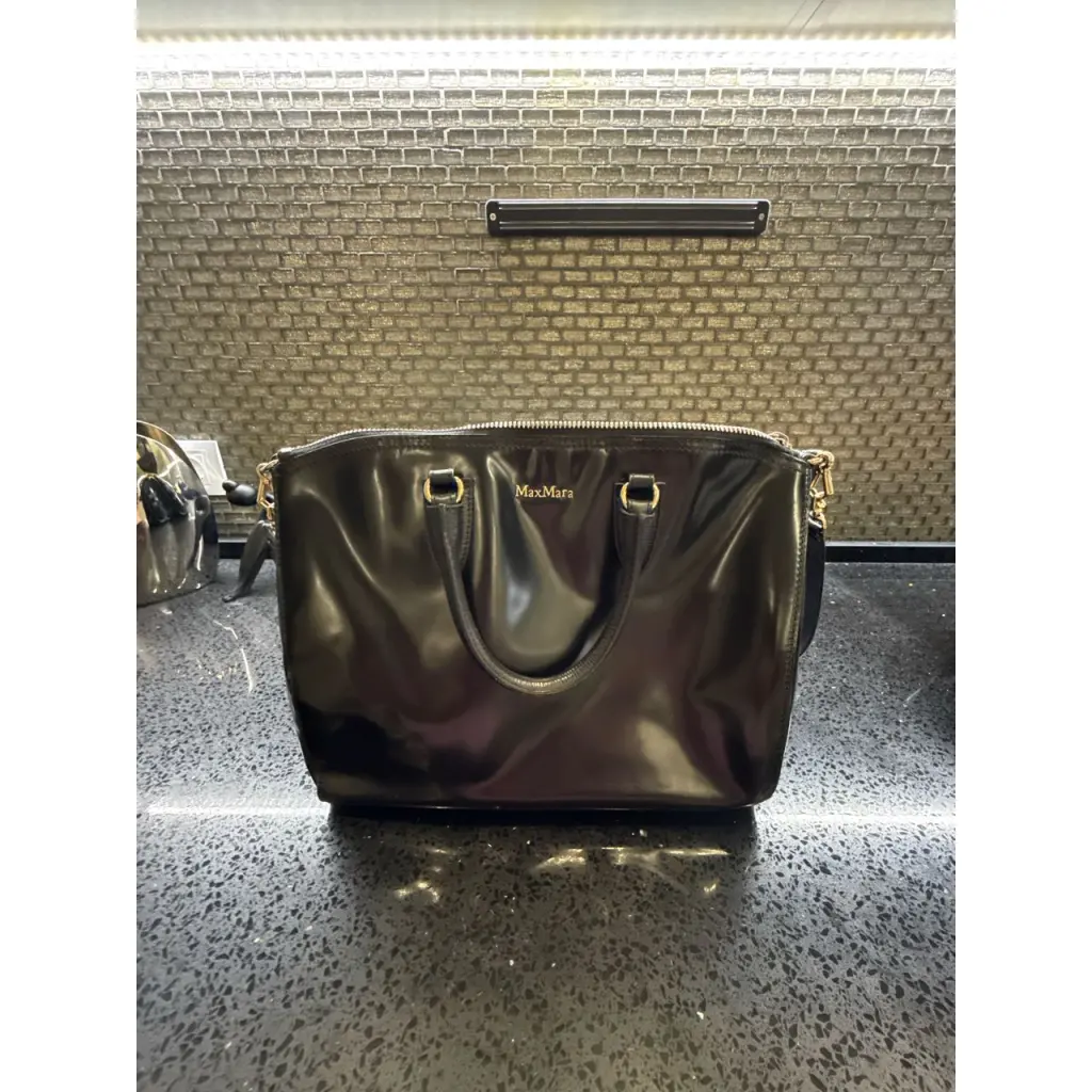 Элегантная лакированная сумка первой линии Max Mara с короткими ручками и плечевым ремнём. 100% лакированная кожа. ЦВЕТ: чёрный