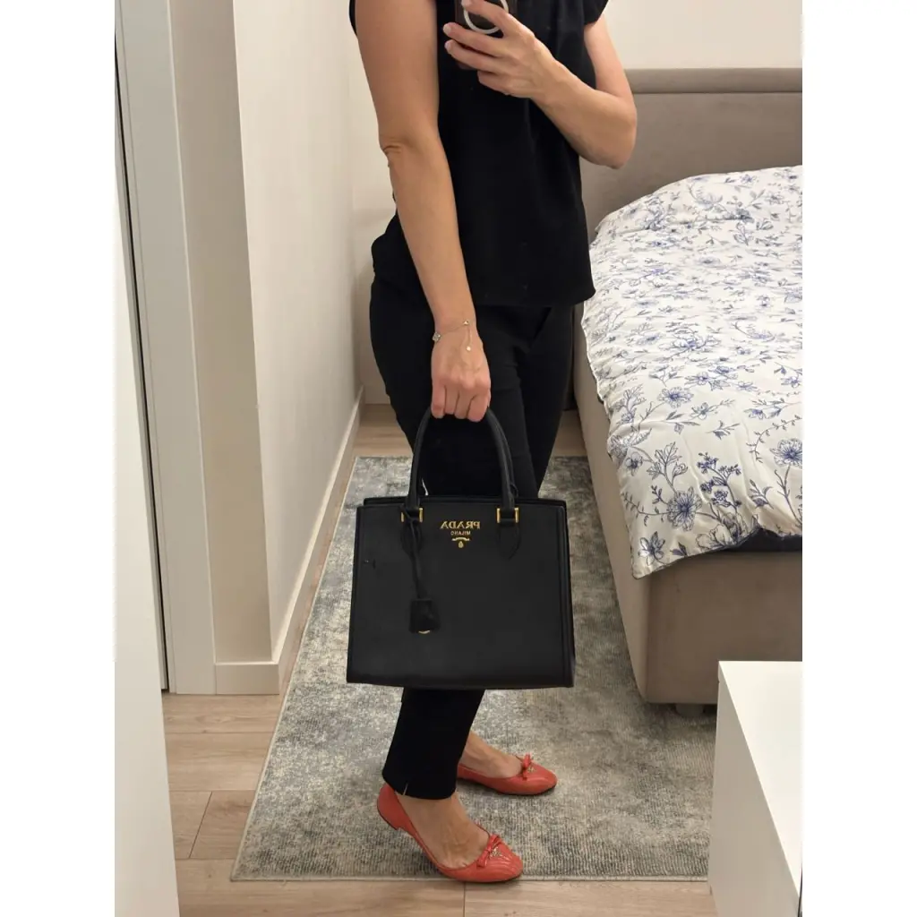 Черная сумка Prada из натуральной кожи с золотой фурнитурой.