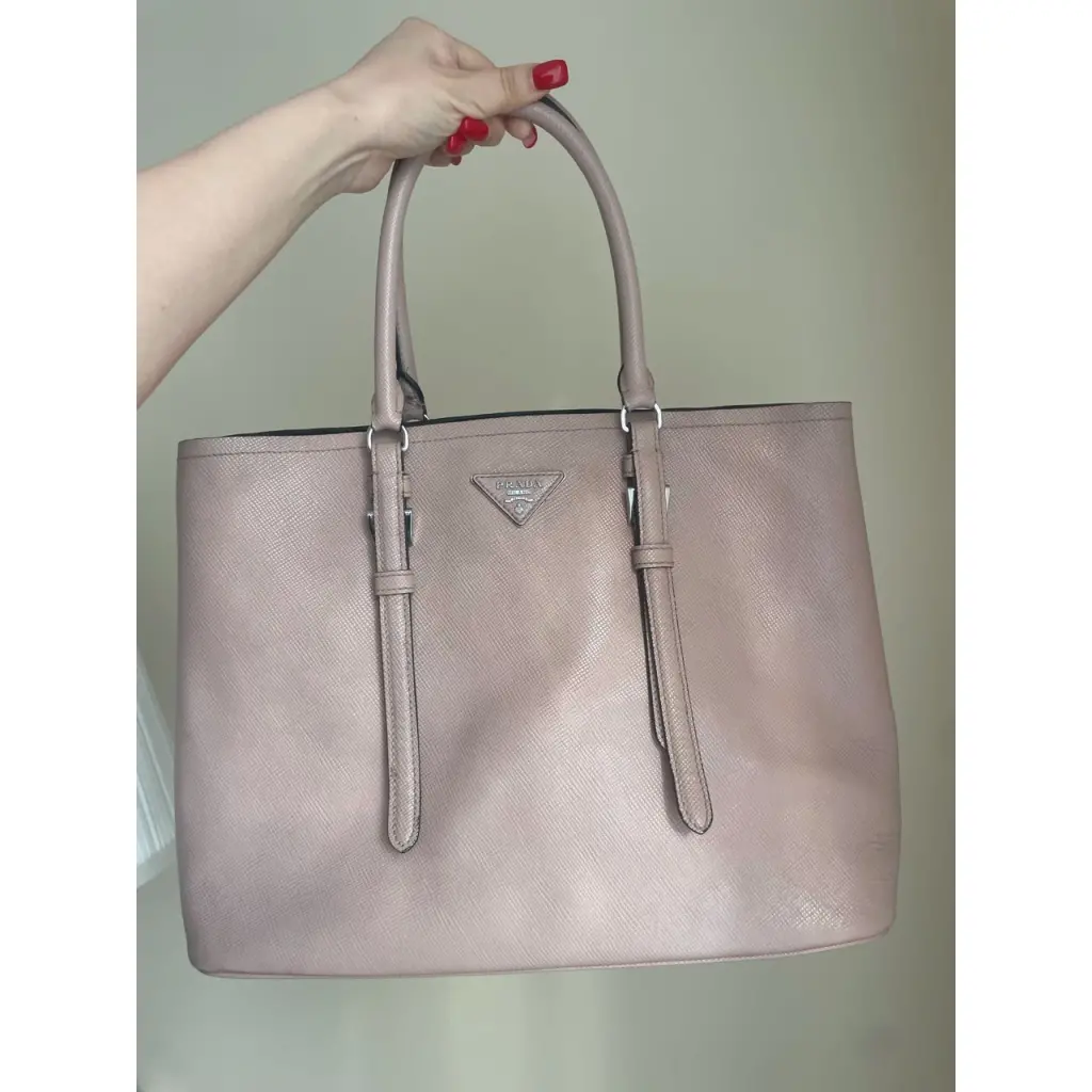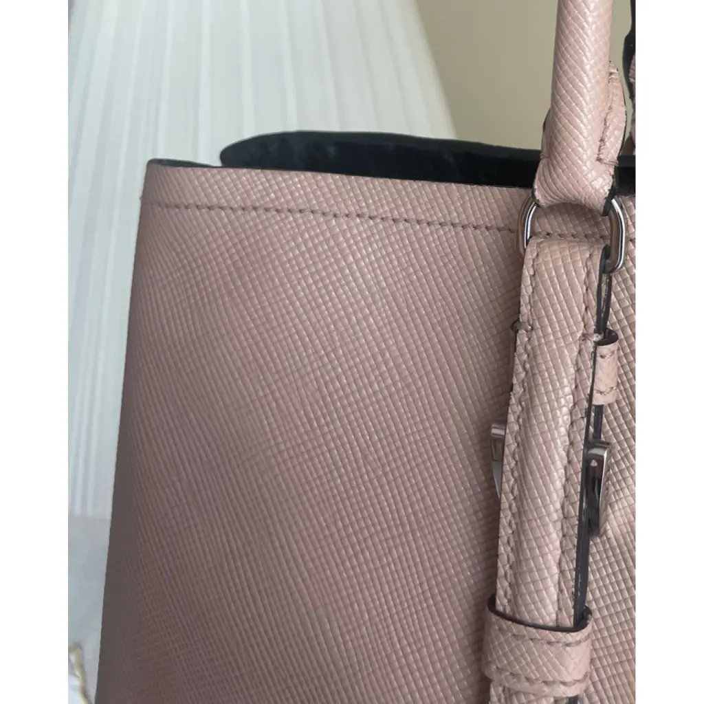 Сумка Prada Double в цвете пыльная роза. При разном освещении кажется то больше пыльной розой, то бежевой. Кожа Safiano. 26x36x16 см. В комплекте пыльник. Брелок и плечевой ремень утеряны, в цене учтено.