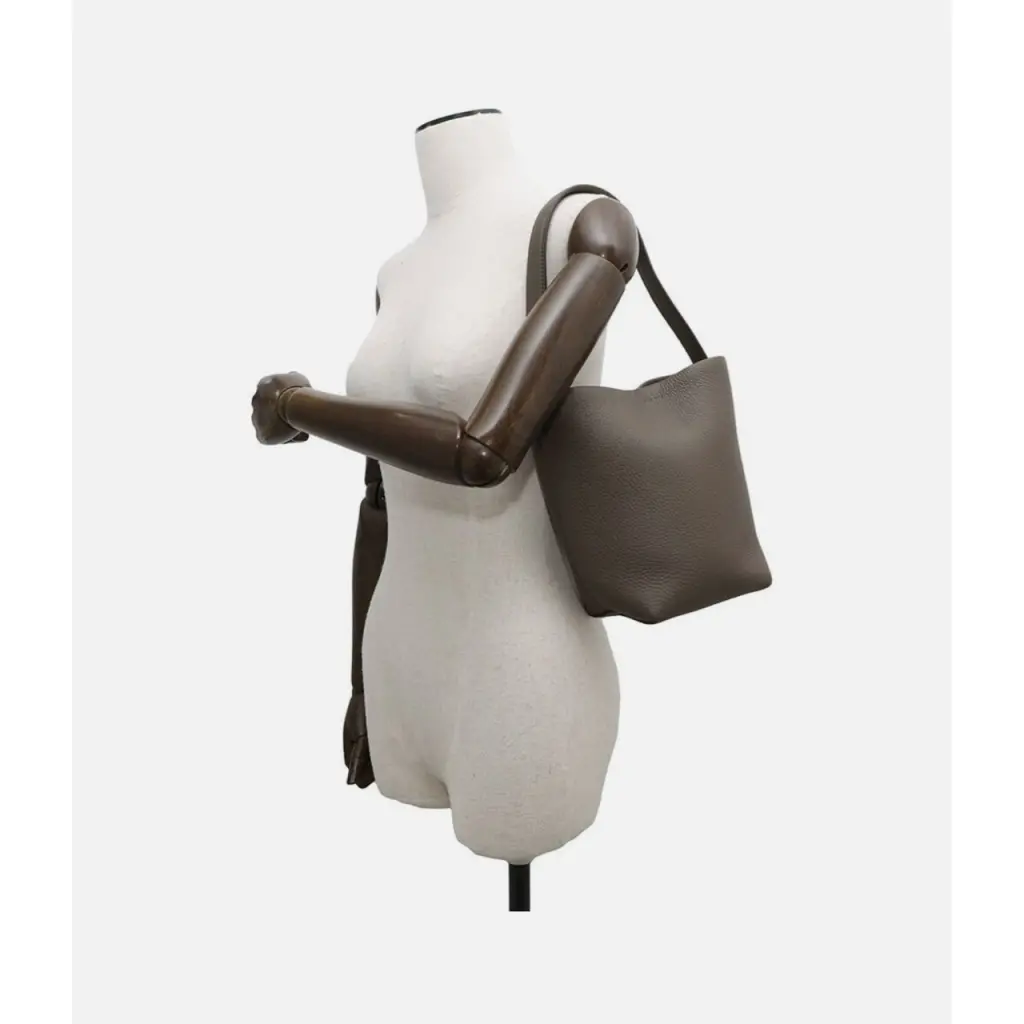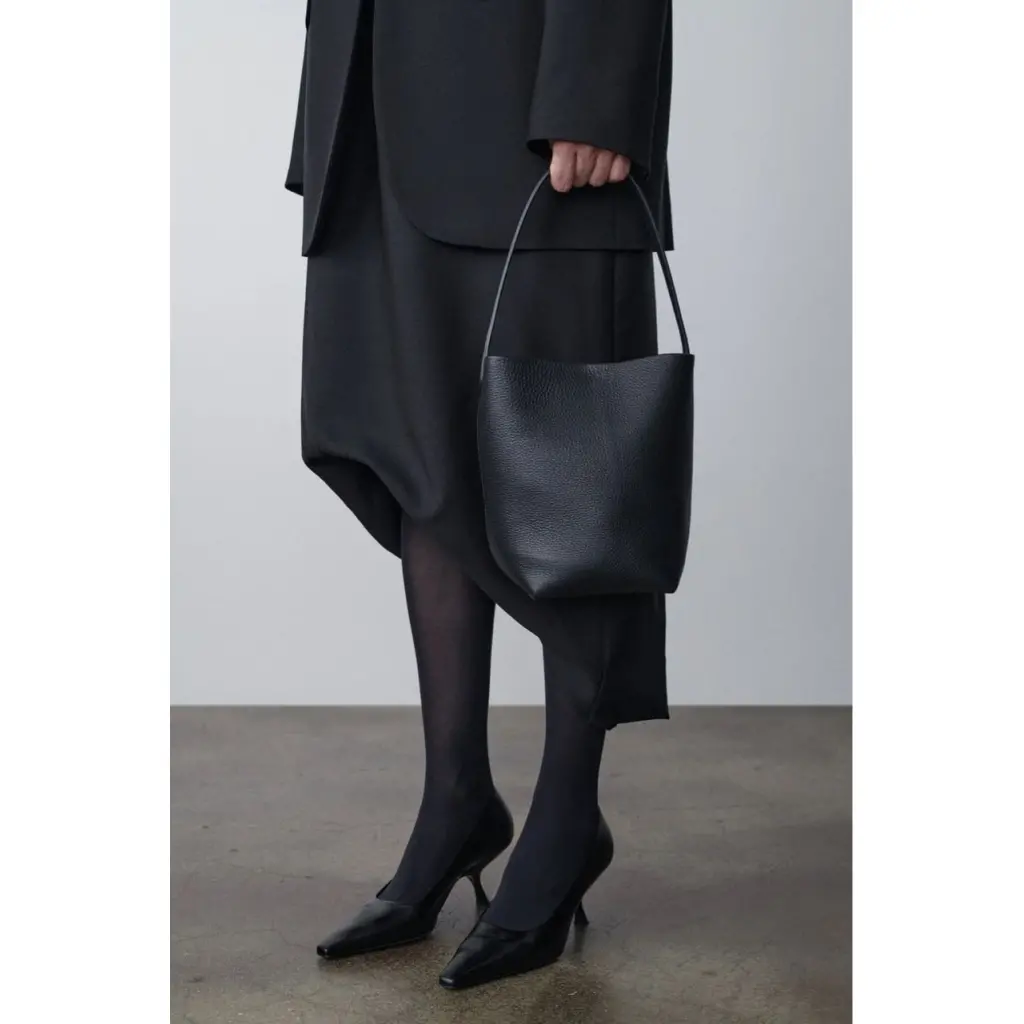 Classic tote bag in grained calfskin leather with interior toggle closure and flat handle.