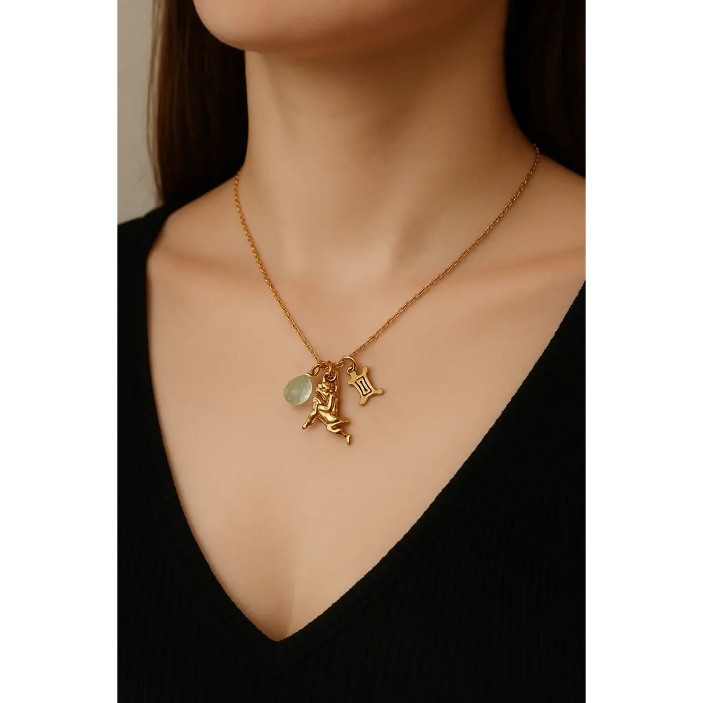 Цепочка с мелкими звеньями, подвеска из трех кулонов - капелька, ангелочек и фирменный логотип, из ювелирного сплава с позолотой.
