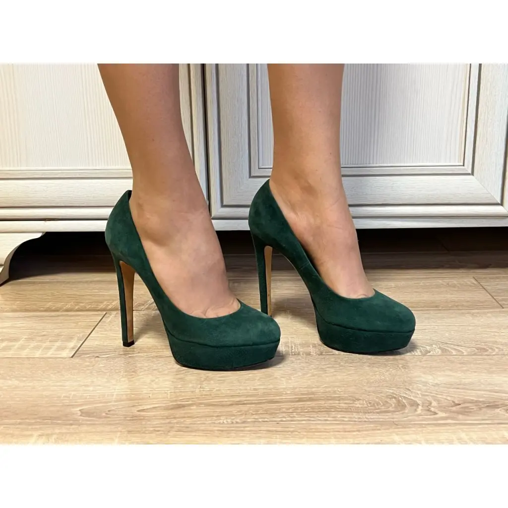 Классические замшевые туфли на платформе и высоком тонком каблуке-шпильке в цвете изумрудный