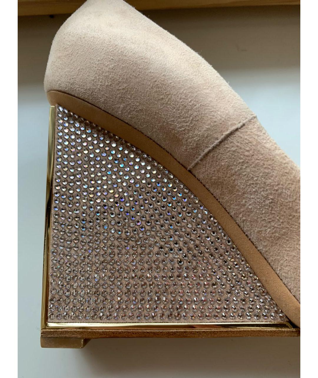 Замшевые туфли Louis Vuitton бежевого цвета с открытым носиком на танкетке из страз. Идеальное состояние, фактически только примерялись, никогда не носились. Дефектов нет. Прекрасный вечерний вариант.