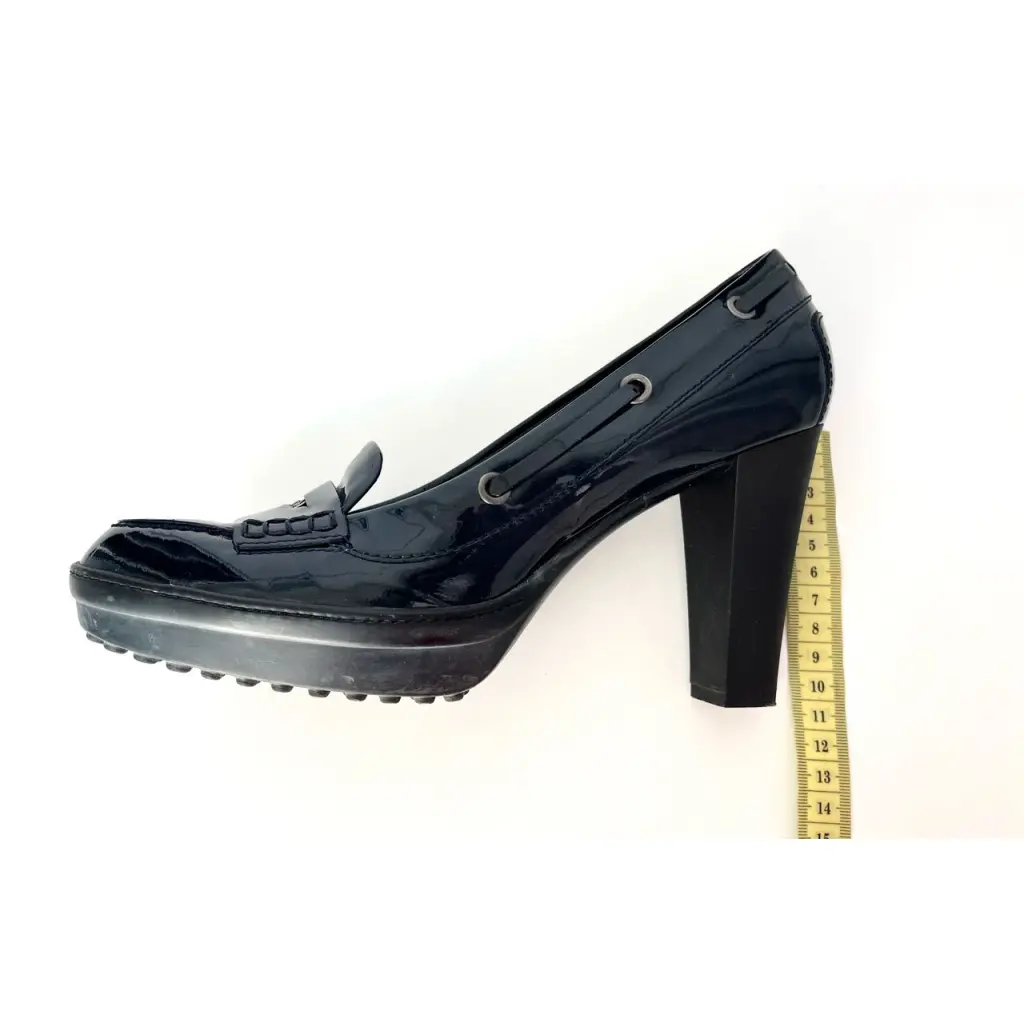 Туфли-лоферы на каблуке Tod’s. Комфортная модель с платформой в носочной части. Лаковая кожа глубокого синего цвета. Маркировка 39,5, подойдут на 39. Одевались два раза, в отличном состоянии. Без комплекта.