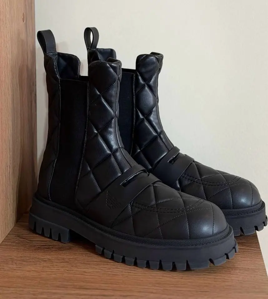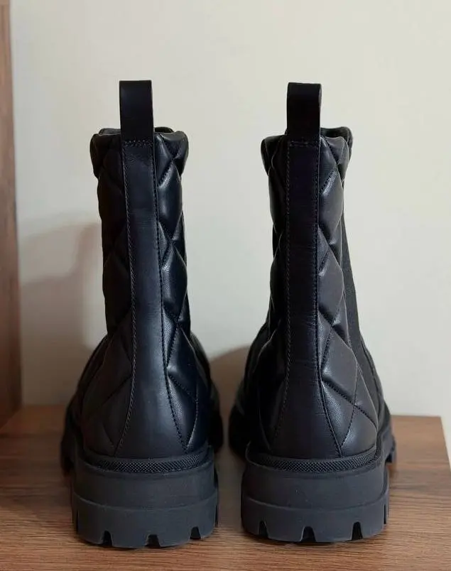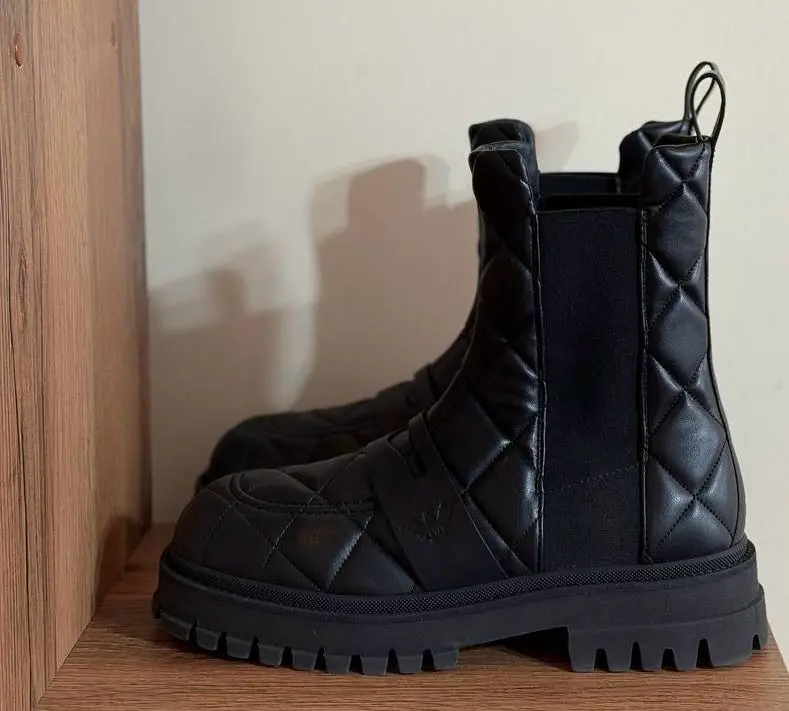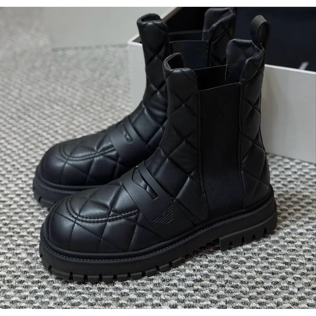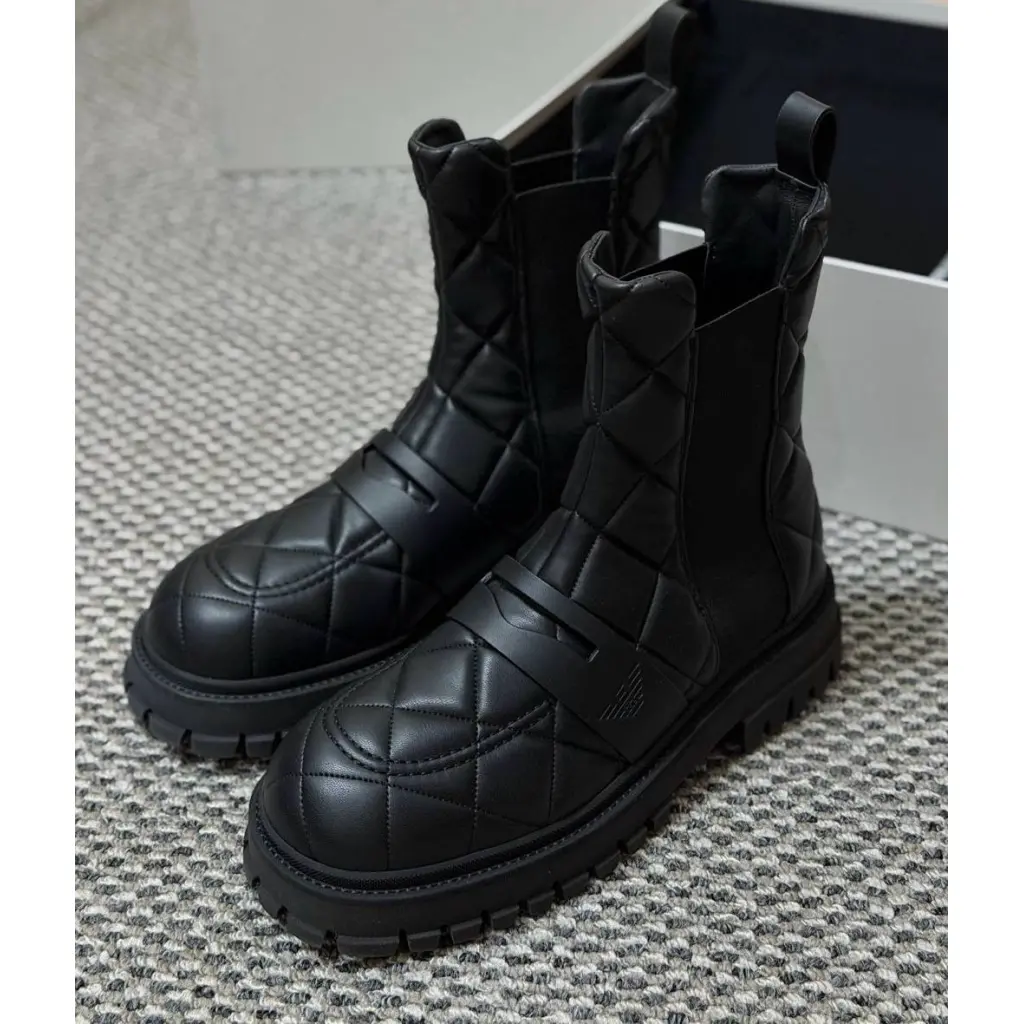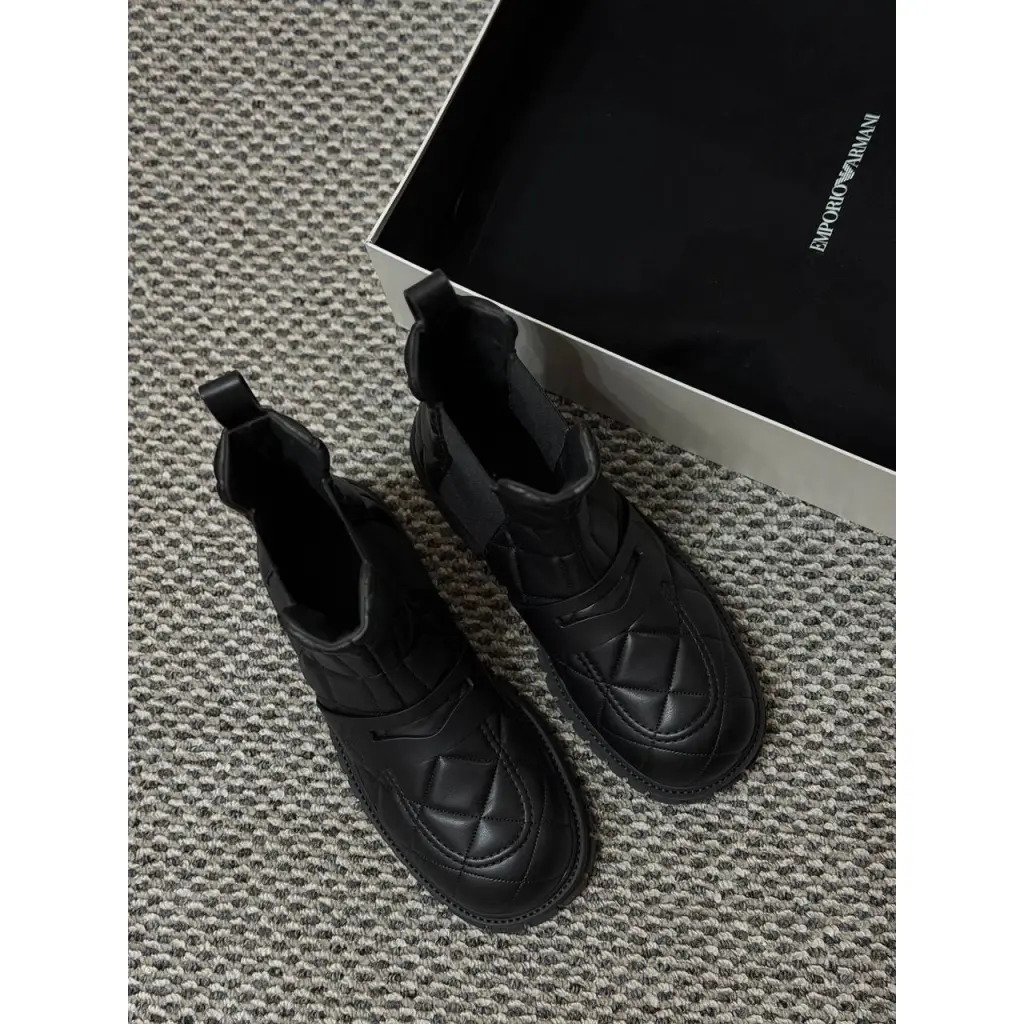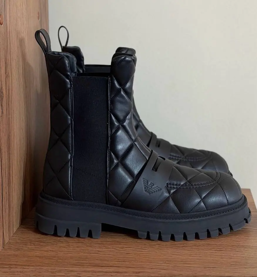 Черные стеганые сапоги дополнены эластичными вставками в лучших традициях классических челси. Они выполнены из мягкого технологичного материала при этом прочного в носке , который визуально и тактильно имитирует матовую кожу. Массивная литая подошва и круглый мыс придают паре актуальный силуэт, а передняя перемычка с фигурным вырезом украшена тисненым логотипом марки, созданной Джорджо Армани