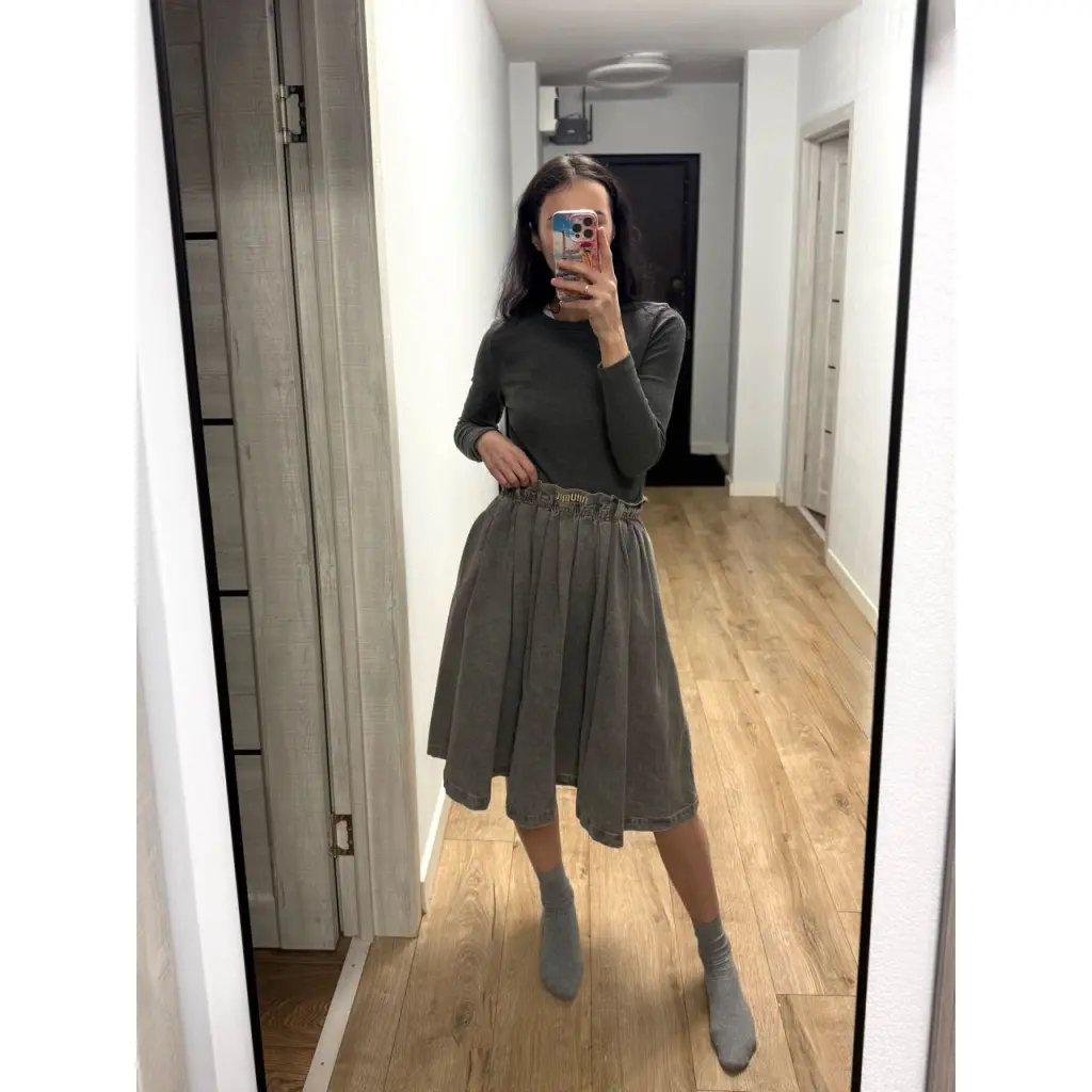 Юбка Miu miu из серого вареного денима. Состав хлопок 100%. Фасон юбка-солнце. На талии широкая резинка, без молнии. На резинке логотип бренда