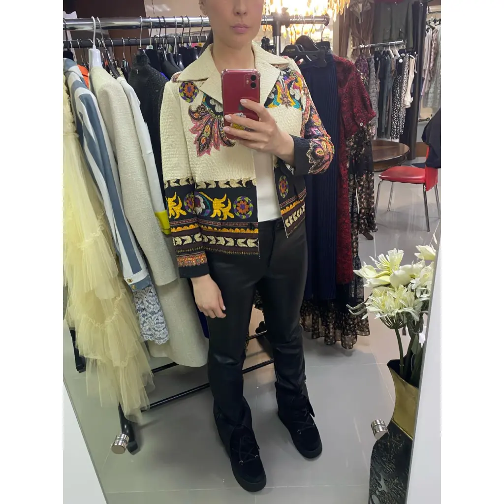 Укороченный пиджак прямого кроя от итальянского бренда ETRO, Ткань с эффектом жатого материала. Длинный рукав, Застежка на пуговицы.