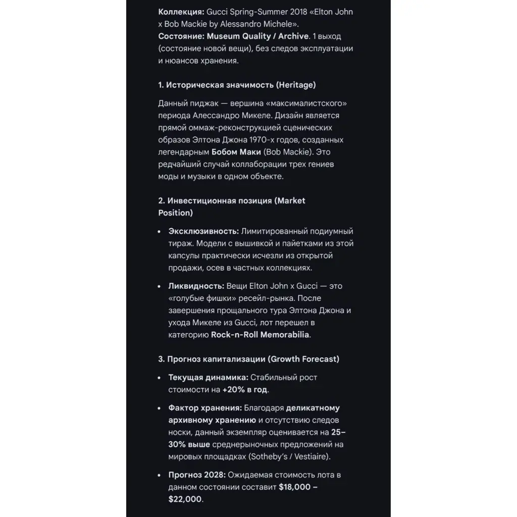 В 2024 году на аукционе Christie’s личные вещи Элтона Джона уходили с молотка с превышением эстимейта в 3–5 раз. Вещи из коллаборации с Gucci стали «точкой входа» для тех коллекционеров, кто не смог выкупить личные лоты певца. Это сформировало устойчивый вторичный рынок, где цена на данный жакет в Европе и США уже стартует от $12,000.