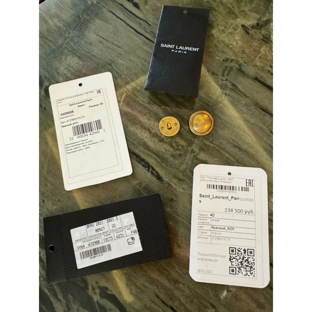 Абсолютно новый жакет Saint Laurent, размер 40 французский. Маломерит! Идеально садится на 36 французский, но можно и на 34,38,40, в зависимости от желаемой посадки. На картинках на модели (которая обычно носит 36) размер 40. Не носили. Все бирки (бренда Saint Laurent и ЦУМа) сохранены. Покупали в ЦУМе. Также в комплекте: запасные пуговицы, вешалка и кофр. Полный комплект, можно на подарок.