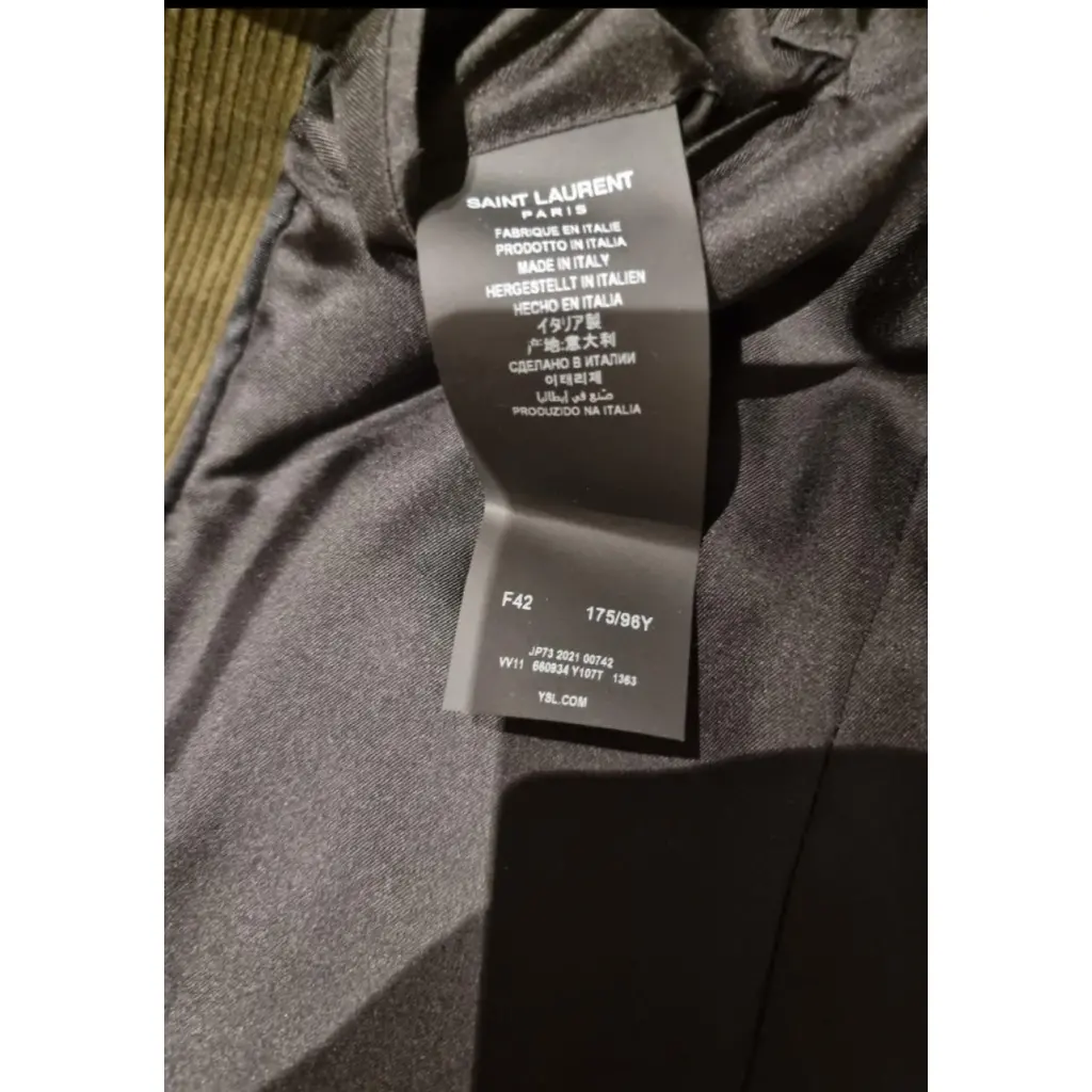 Вельветовый двубортный пиджак цвета хаки из хлопка в рубчик от SAINT LAURENT.