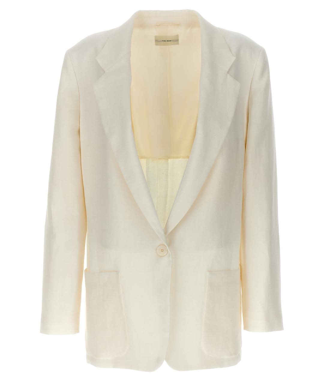 'Enza' single-breasted linen blazer with single button closure, side pockets, peak lapels, half lining.
