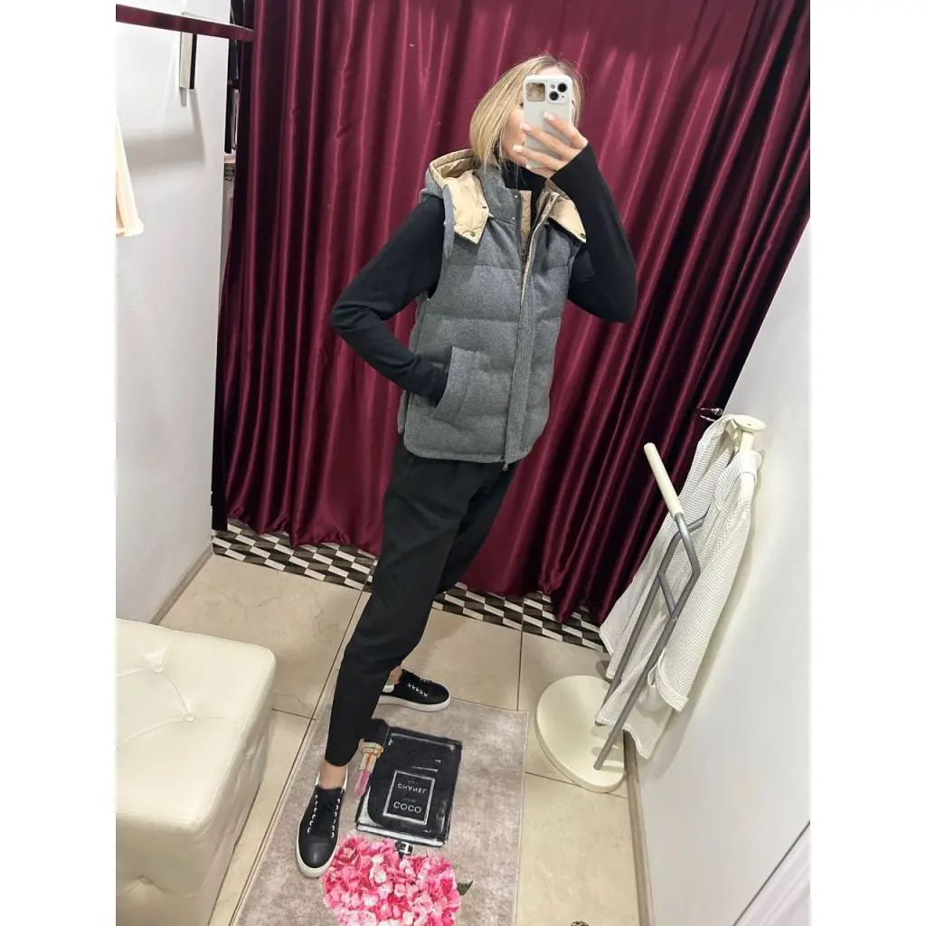 Жилет женский Brunello cucinelli 2-сторонний, серый трикотаж, бежевый нейлон размер IT40 на замке проходит манилья, низ кулиска с затяжкой , капюшон на кнопках отстегивается 100% кашемир