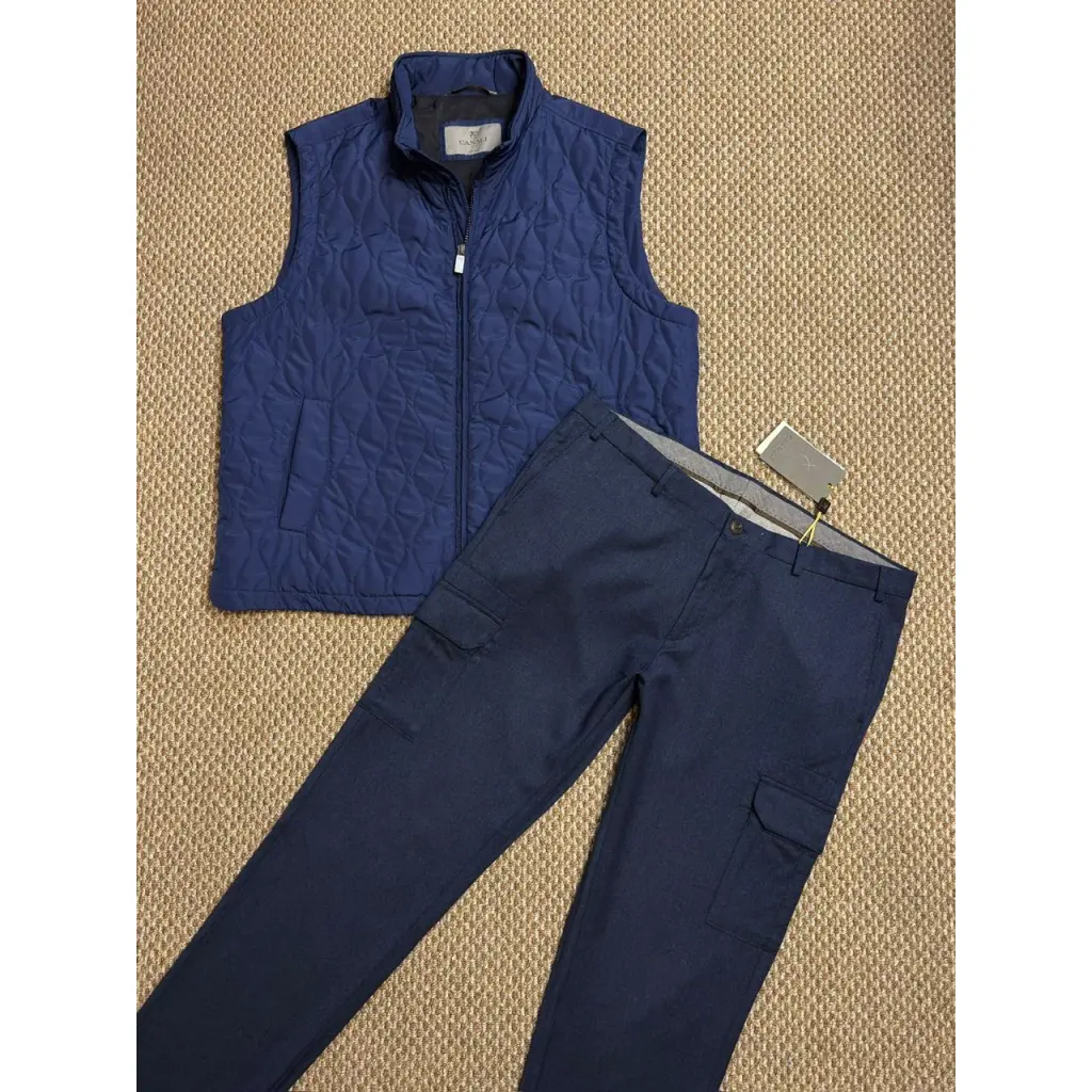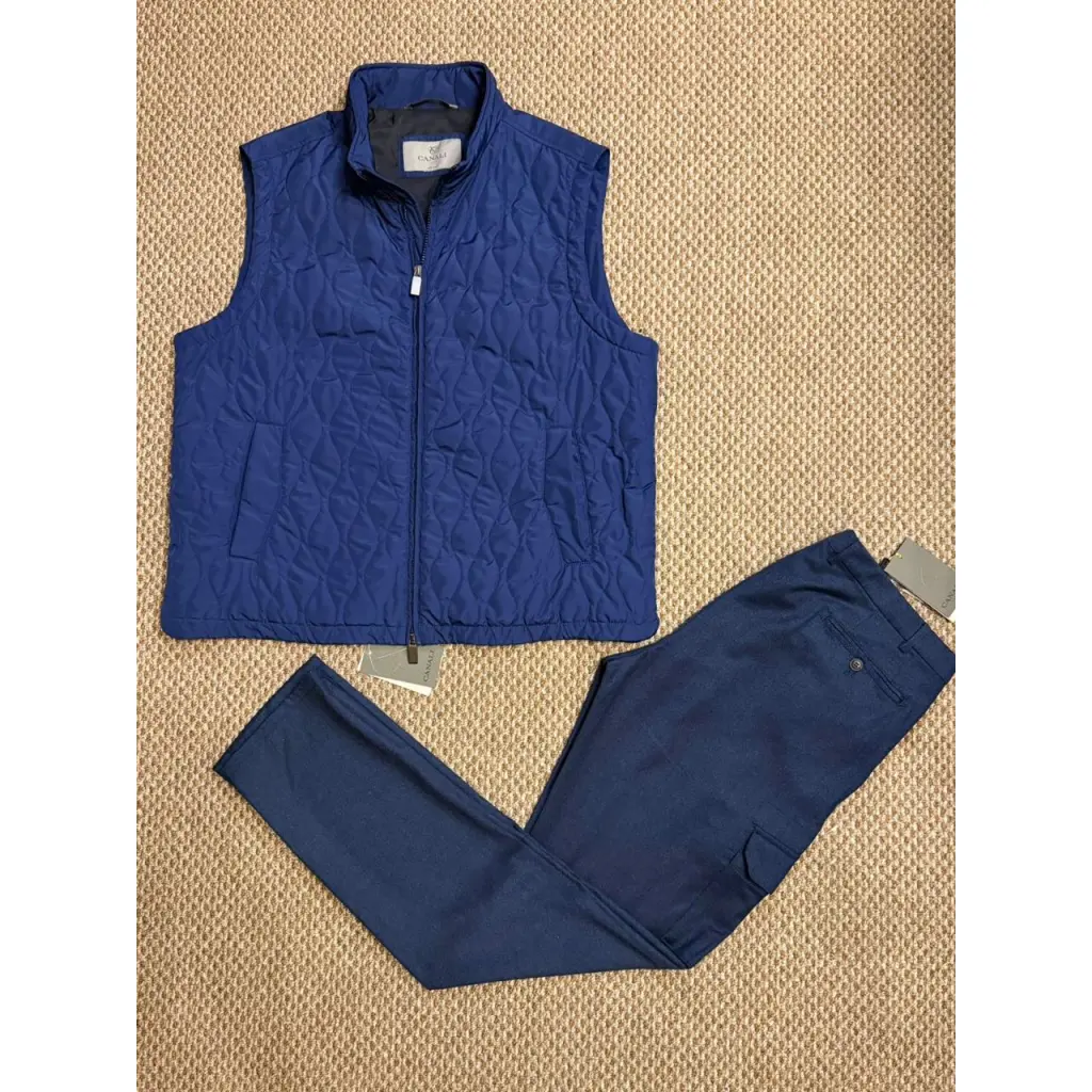 Синий жилет из весенне-летней коллекции идеально подойдет для прогулок в межсезонье: в теплую погоду его можно носить как верхнюю одежду, а в холодную - как согревающий слой под пальто. Для пошива стеганой модели использовали прочную техническую ткань, обработанную водоотталкивающим составом. Изделие с воротником-стойкой утеплили тонким слоем почти невесомого синтепона
