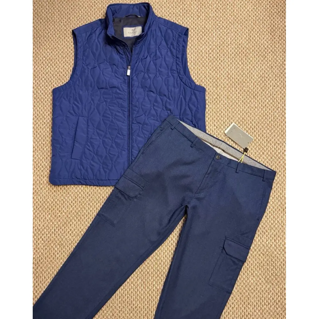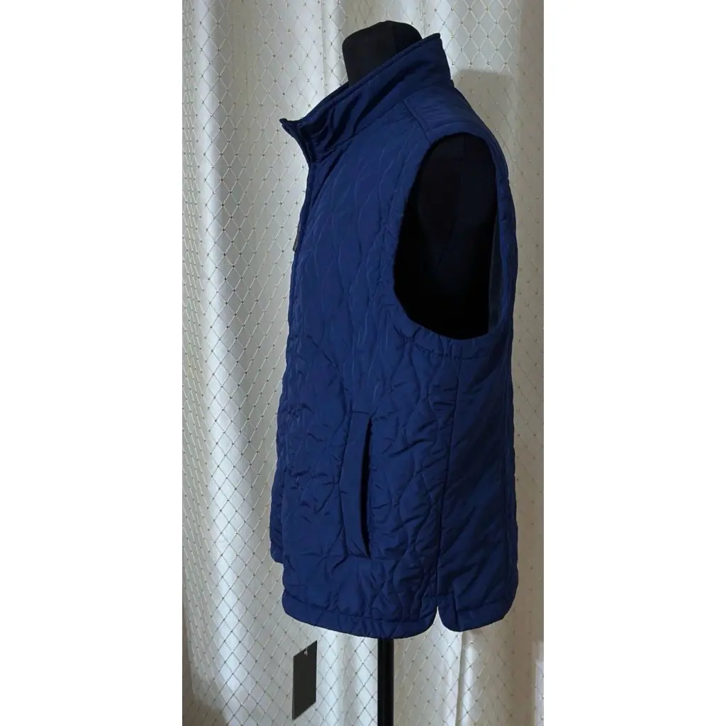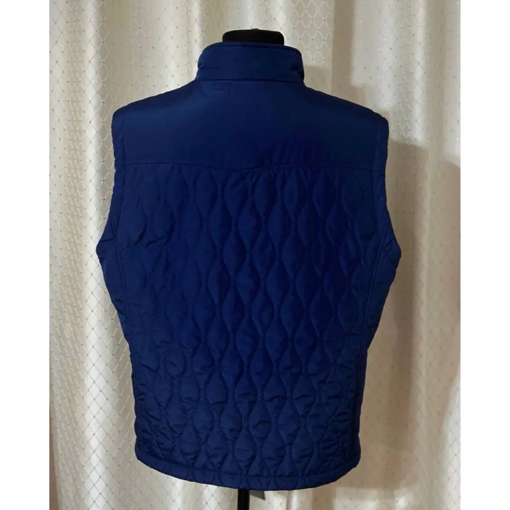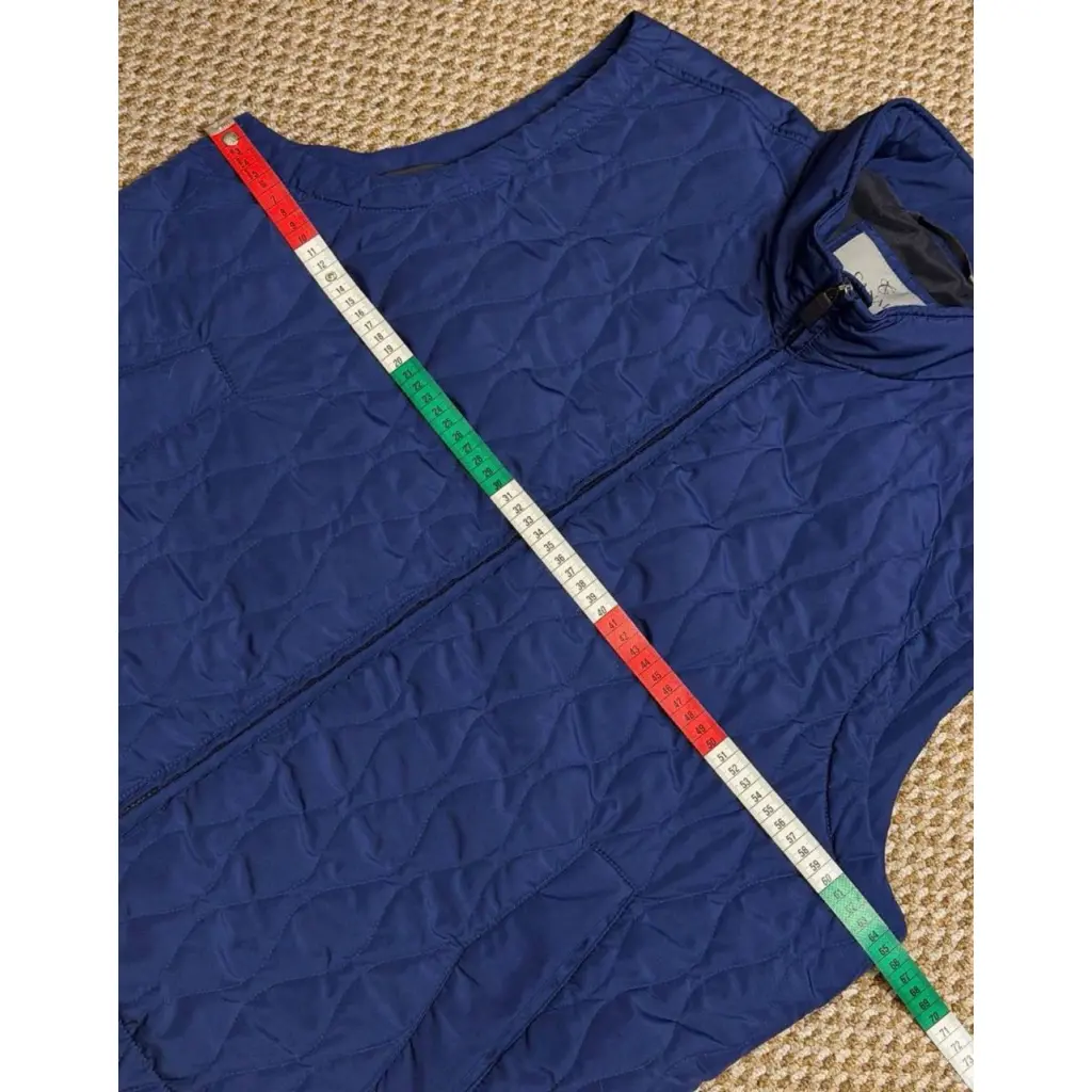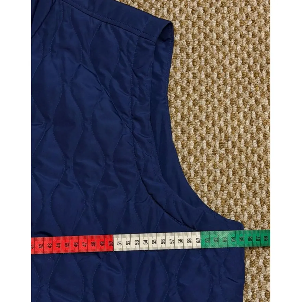 Синий жилет из весенне-летней коллекции идеально подойдет для прогулок в межсезонье: в теплую погоду его можно носить как верхнюю одежду, а в холодную - как согревающий слой под пальто. Для пошива стеганой модели использовали прочную техническую ткань, обработанную водоотталкивающим составом. Изделие с воротником-стойкой утеплили тонким слоем почти невесомого синтепона